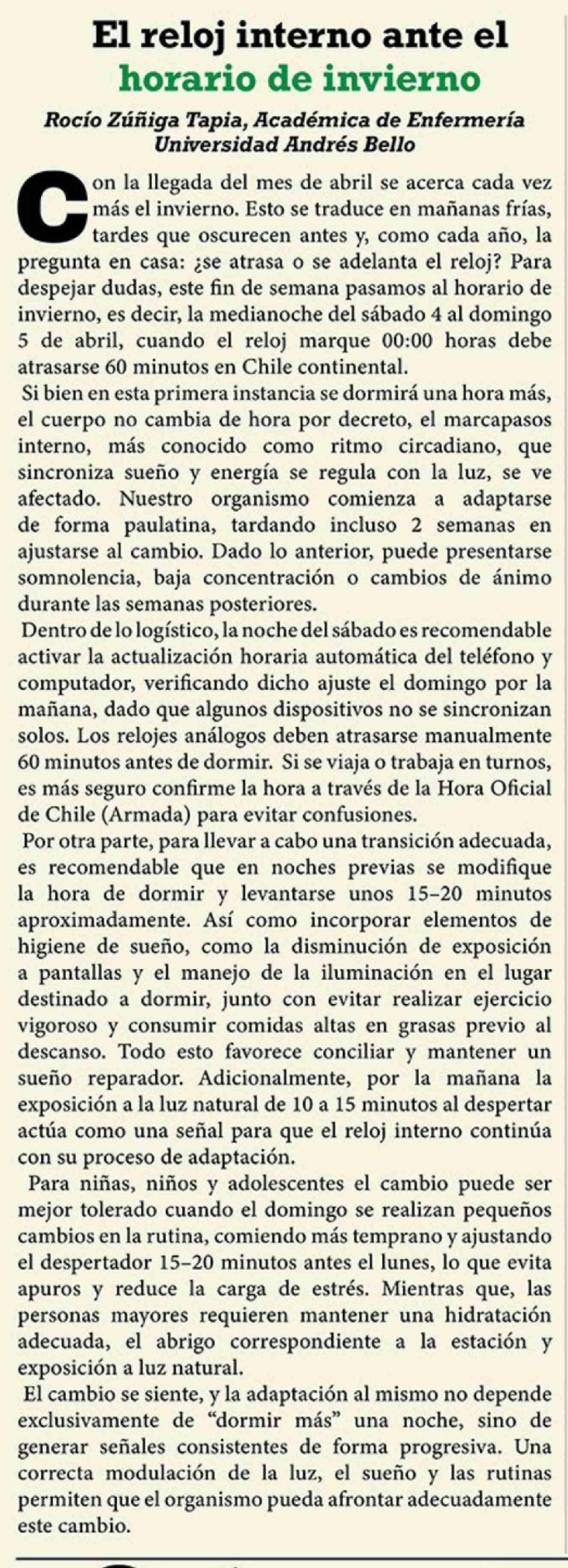 Columnas de Opinión: El reloj interno ante el horario de invierno 01-04-2026 El Heraldo Austral |