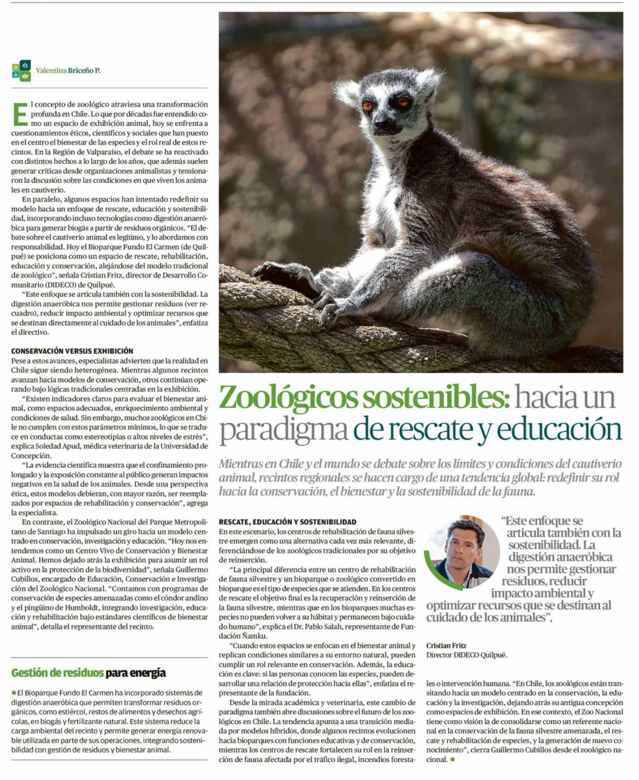 Zoológicos sostenibles: hacia un paradigma de rescate y educación 19-04-2026 El Mercurio de Valparaíso |