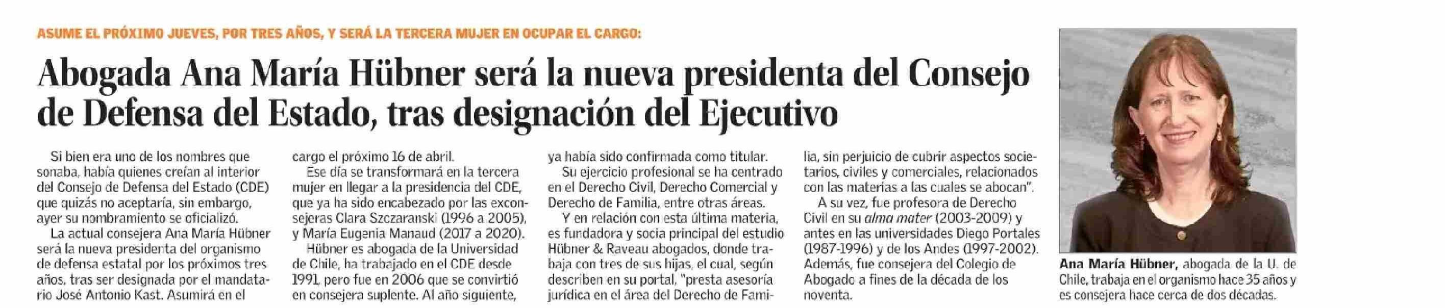 Abogada Ana María Hübner será la nueva presidenta del Consejo de Defensa del Estado, tras designación del Ejecutivo 14-04-2026 El Mercurio |
