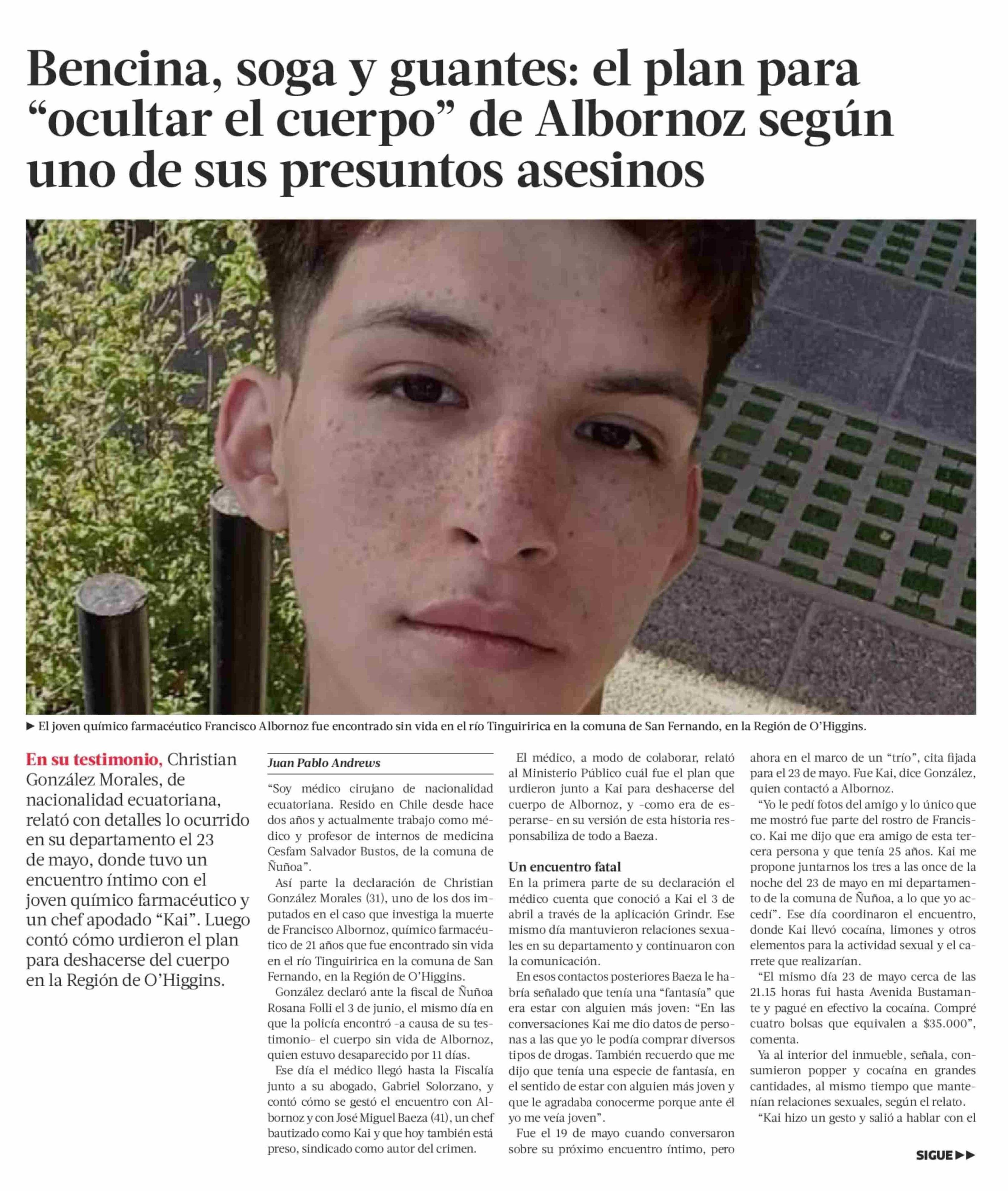 Título: Bencina, soga y guantes: el plan para “ocultar el cuerpo” de Albornoz según uno de sus presuntos asesinos