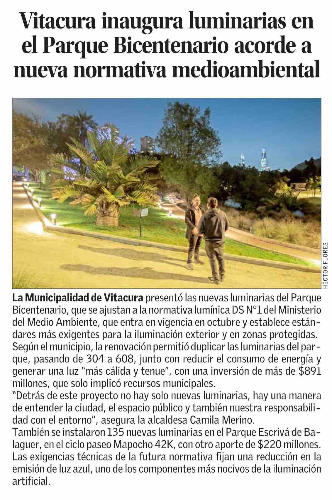 Vitacura inaugura luminarias en el Parque Bicentenario acorde a nueva normativa medioambiental 17-04-2026 El Mercurio |