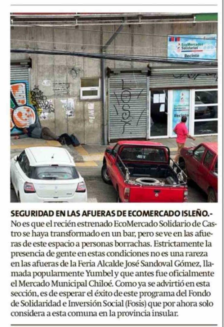 SEGURIDAD EN LAS AFUERAS DE ECOMERCADO ISLEÑO .No es que el recién estrenado EcoMercado Solidario de Castro se haya transformado en un bar, pero se ve en las afueras de este espacio a personas borrachas. Estrictamente la presencia de gente en estas condiciones no es una rareza en las afueras de la F