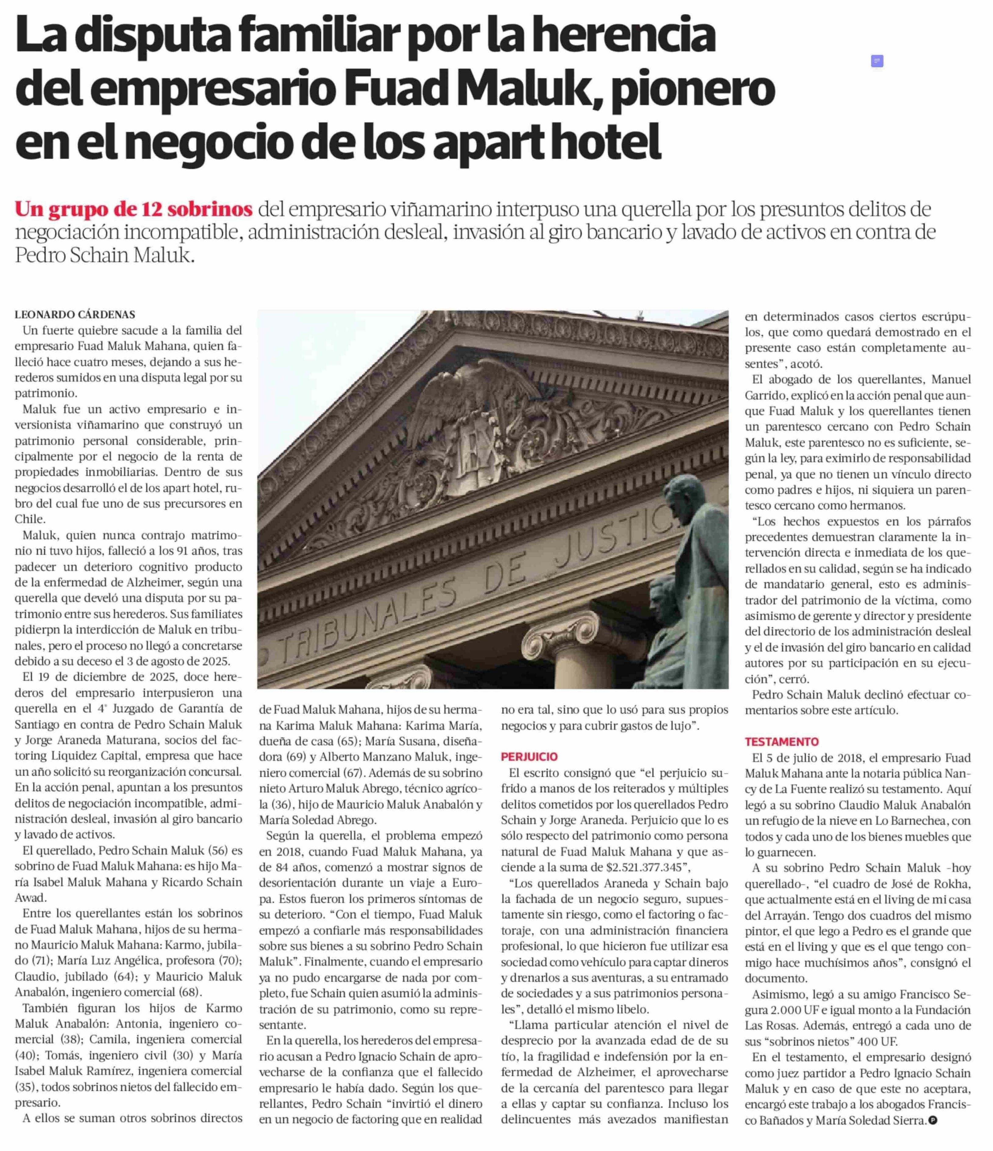 La disputa familiar por la herencia del empresario Fuad Maluk, pionero en el negocio de los apart hotel 06-01-2026 La Tercera |