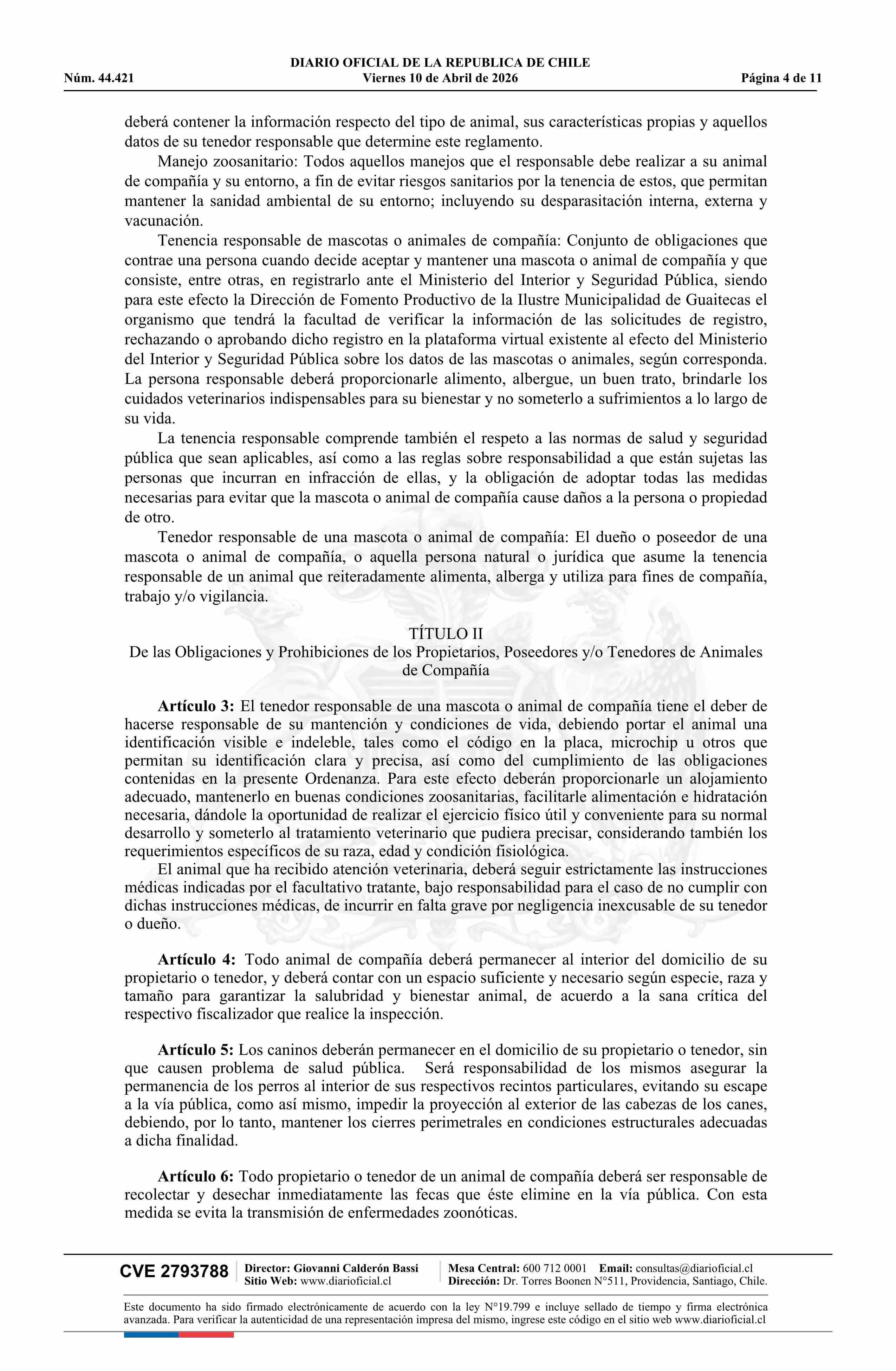 Decreto alcaldicio número 998, de 2025.- Dicta Ordenanza sobre Tenencia Responsable de Mascotas y Animales de Compañía 10-04-2026 Diario Oficial Edición Electrónica |
