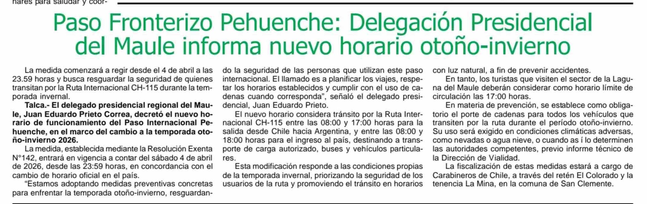 Paso Fronterizo Pehuenche: Delegación Presidencial del Maule informa nuevo horario otoño-invierno 02-04-2026 Maule Hoy |
