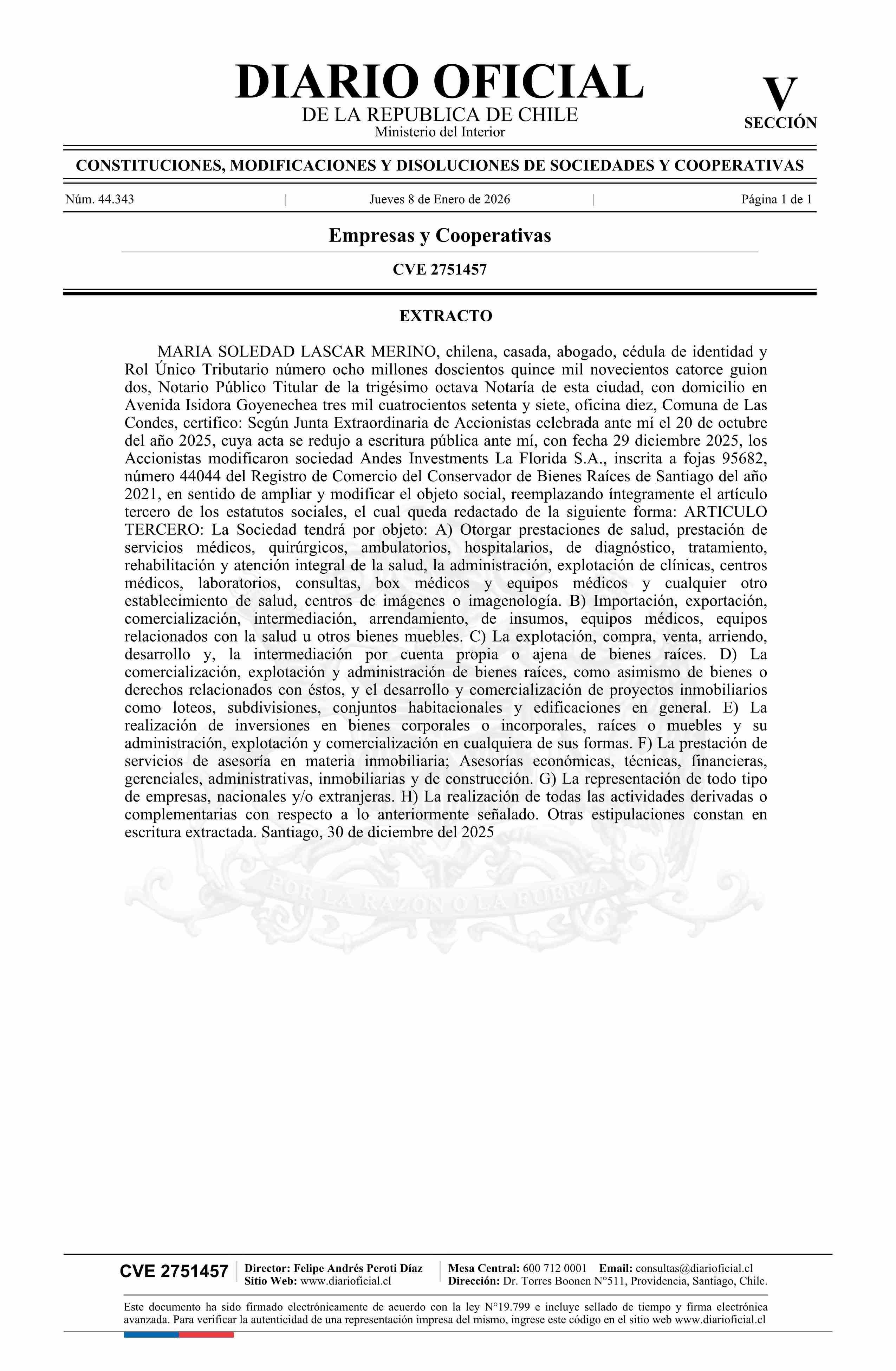 Título: Andes Investments La Florida S.A. 77.498.428-3