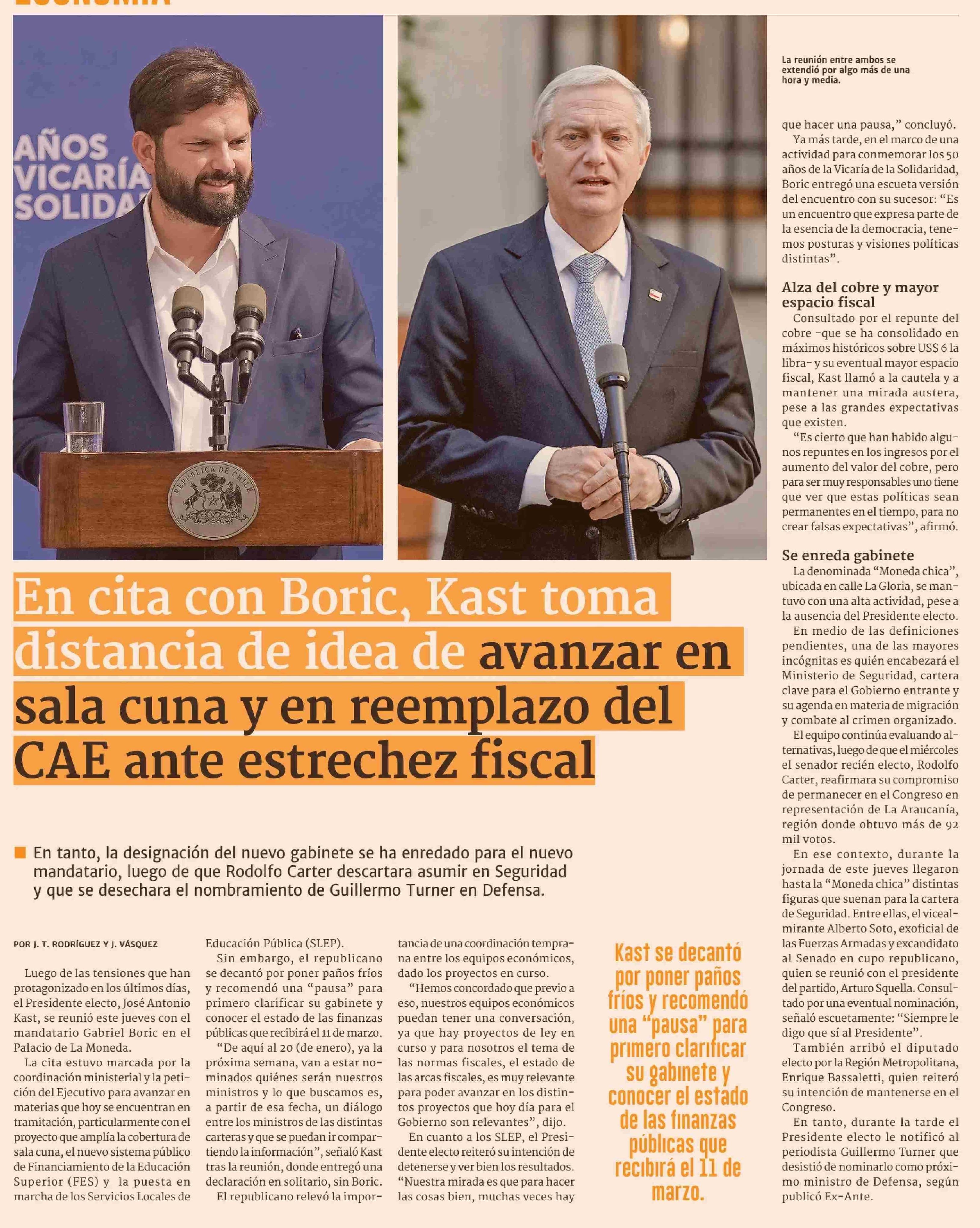 Título: En cita con Boric, Kast toma distancia de idea de avanzar en sala cuna y en reemplazo del CAE ante estrechez fiscal