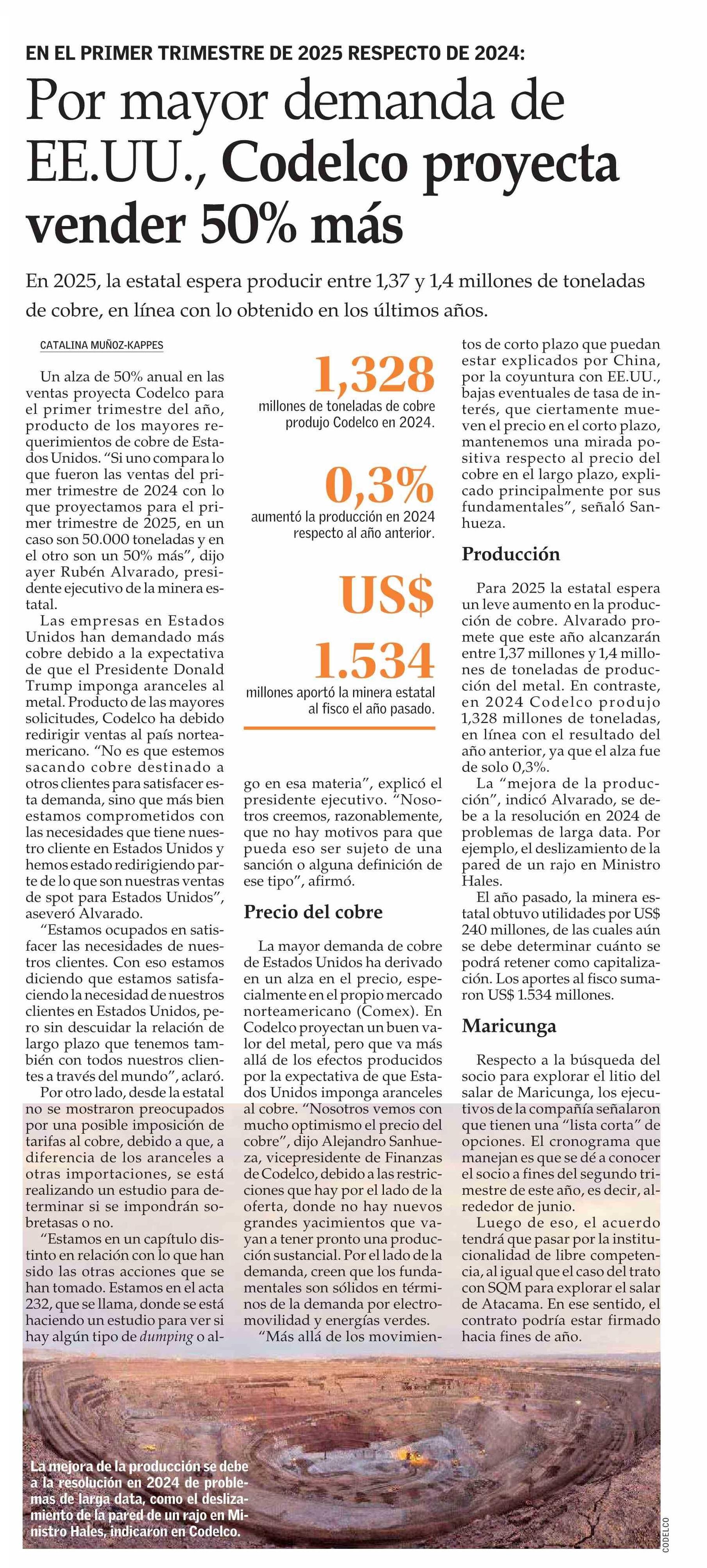 Por mayor demanda de EE.UU., Codelco proyecta vender 50% más 29-03-2025 El Mercurio |