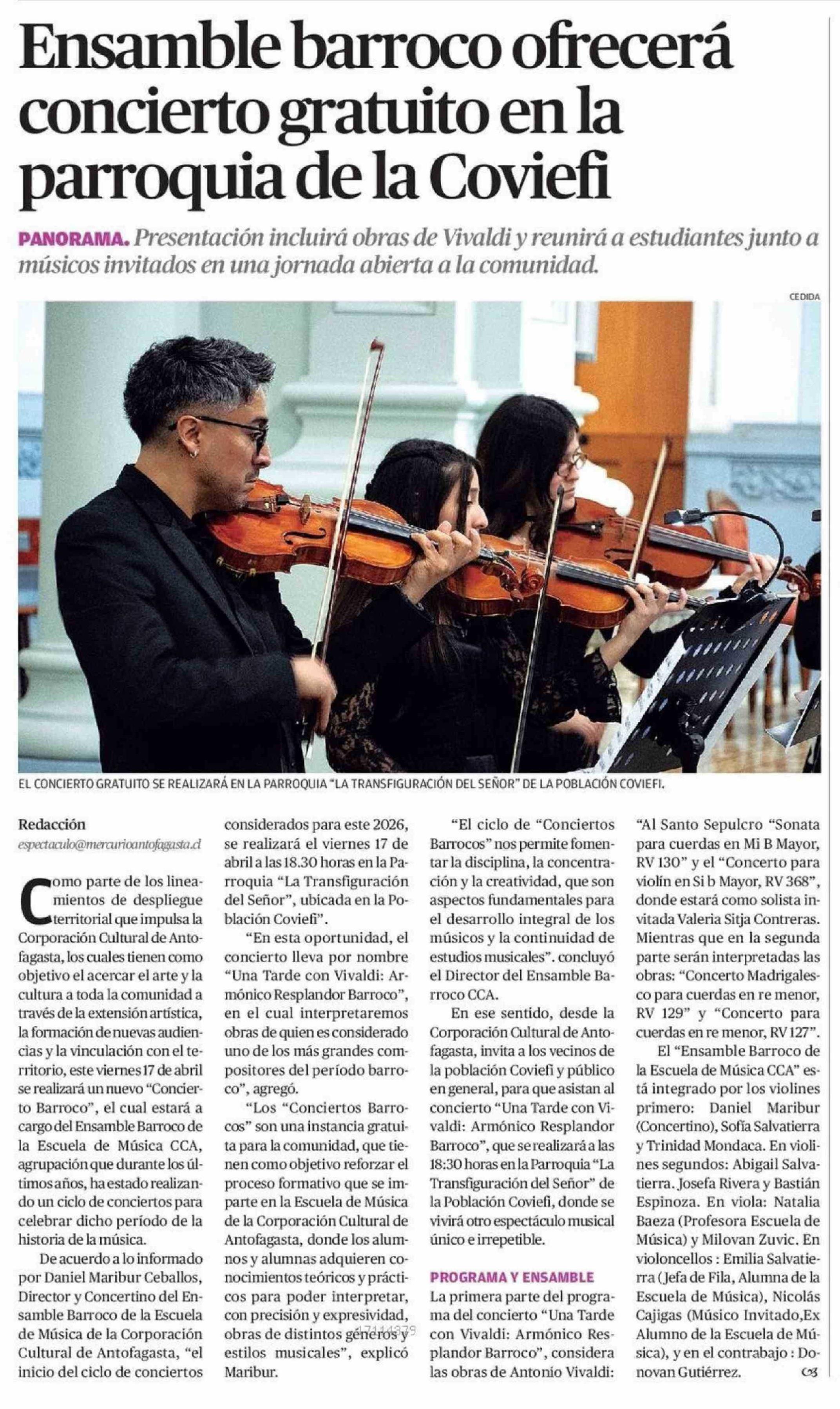 Ensamble barroco ofrecerá concierto gratuito en la parroquia de la Coviefi 16-04-2026 El Mercurio de Antofagasta |