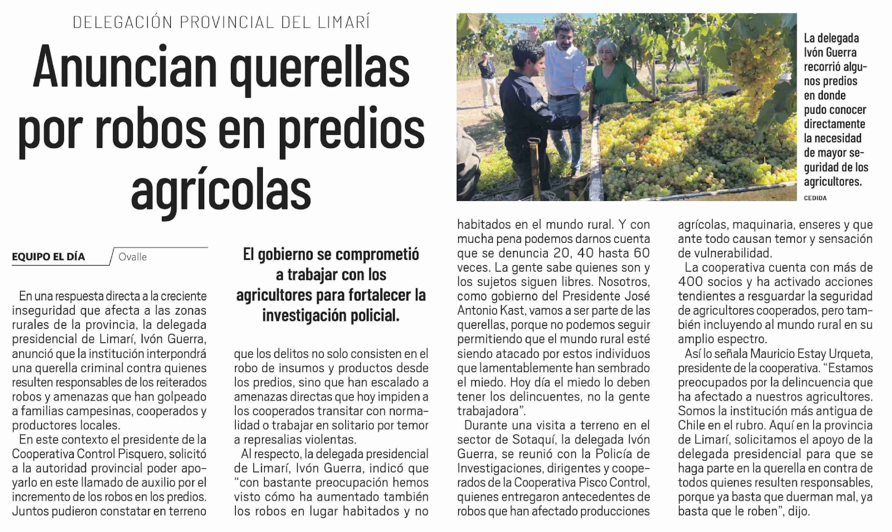 Título: Anuncian querellas por robos en predios agrícolas