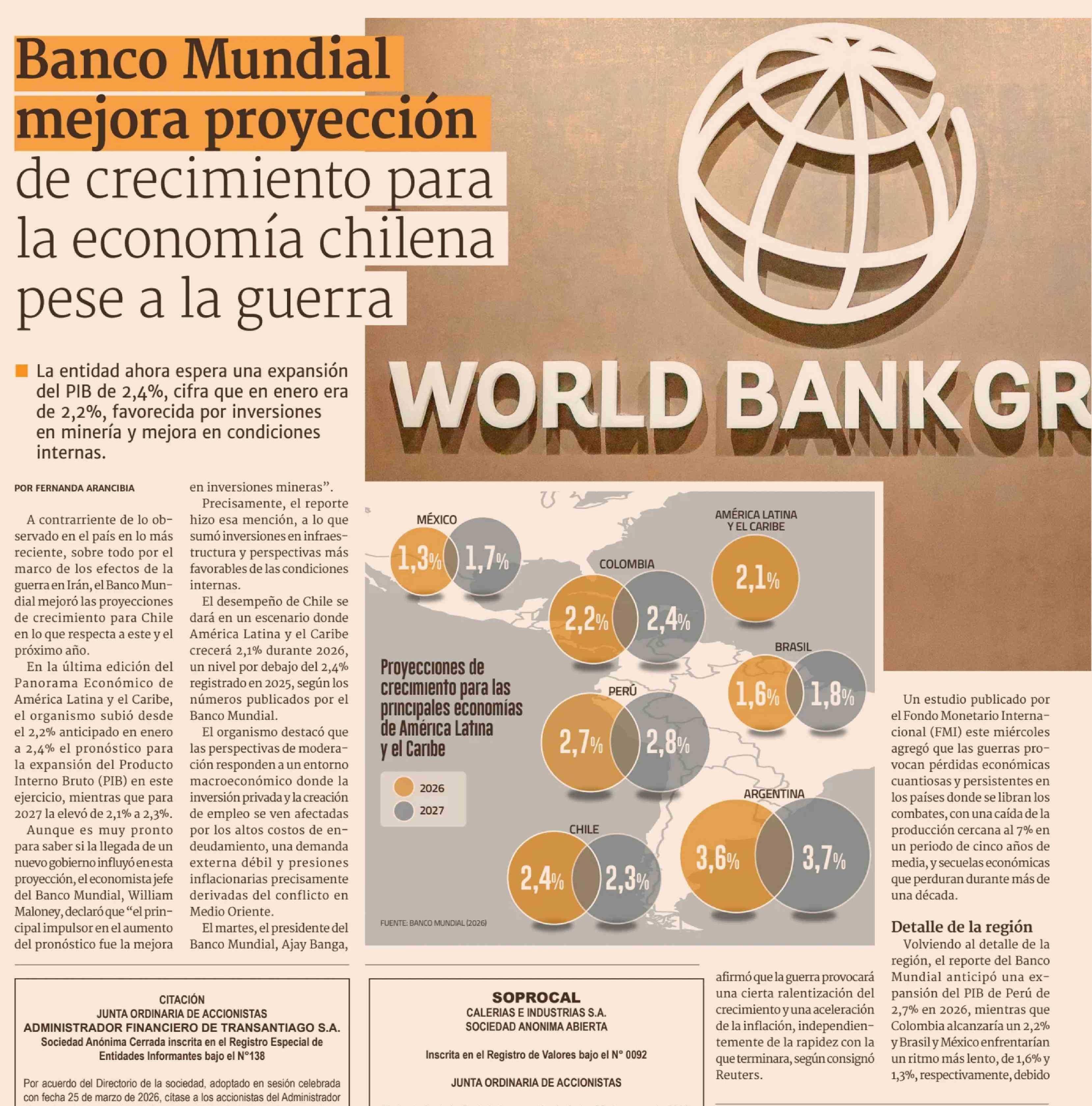 Banco Mundial mejora proyección de crecimiento para la economía chilena pese a la guerra 09-04-2026 Diario Financiero |