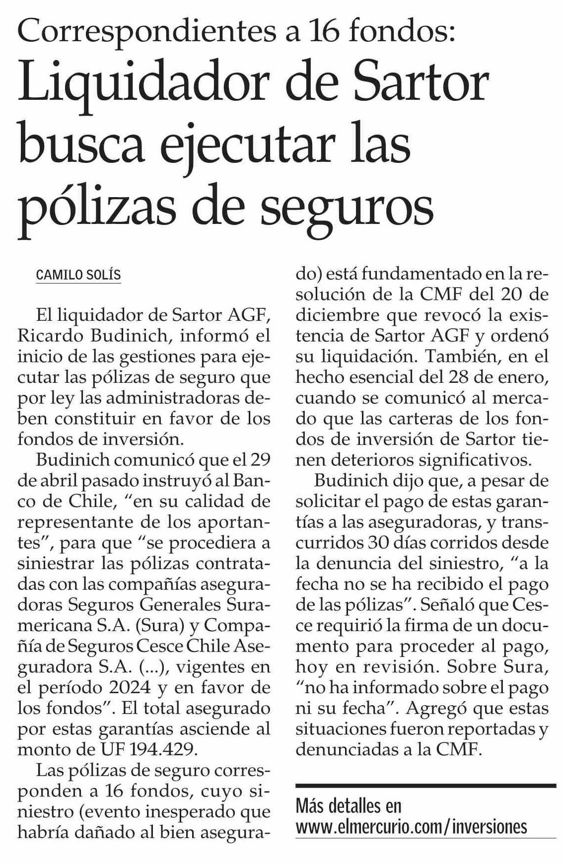 Liquidador de Sartor busca ejecutar las pólizas de seguros 05-06-2025 El Mercurio |