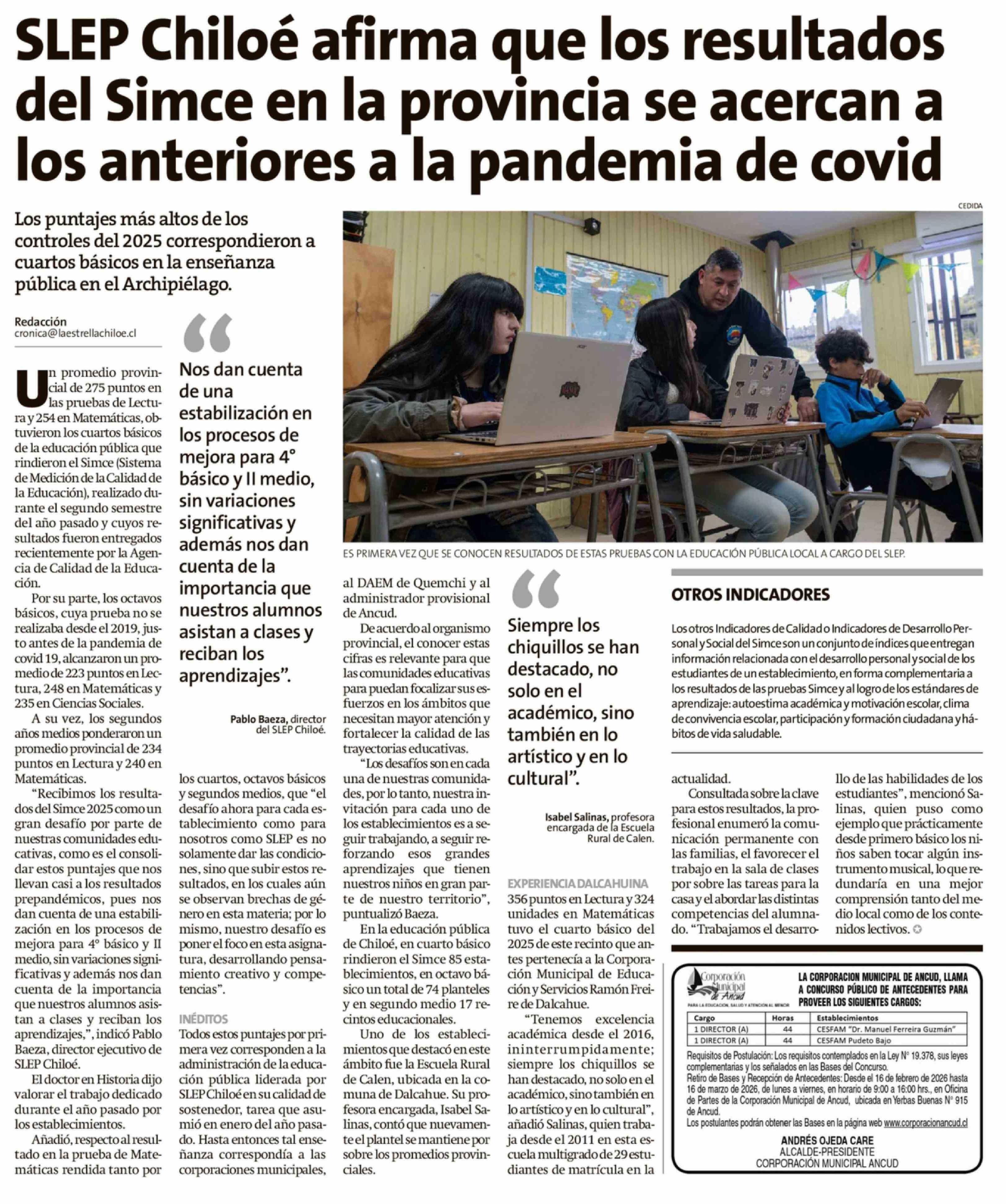 SLEP Chiloé afirma que los resultados del Simce en la provincia se acercan a los anteriores a la pandemia de covid 10-03-2026 La Estrella de Chiloé |