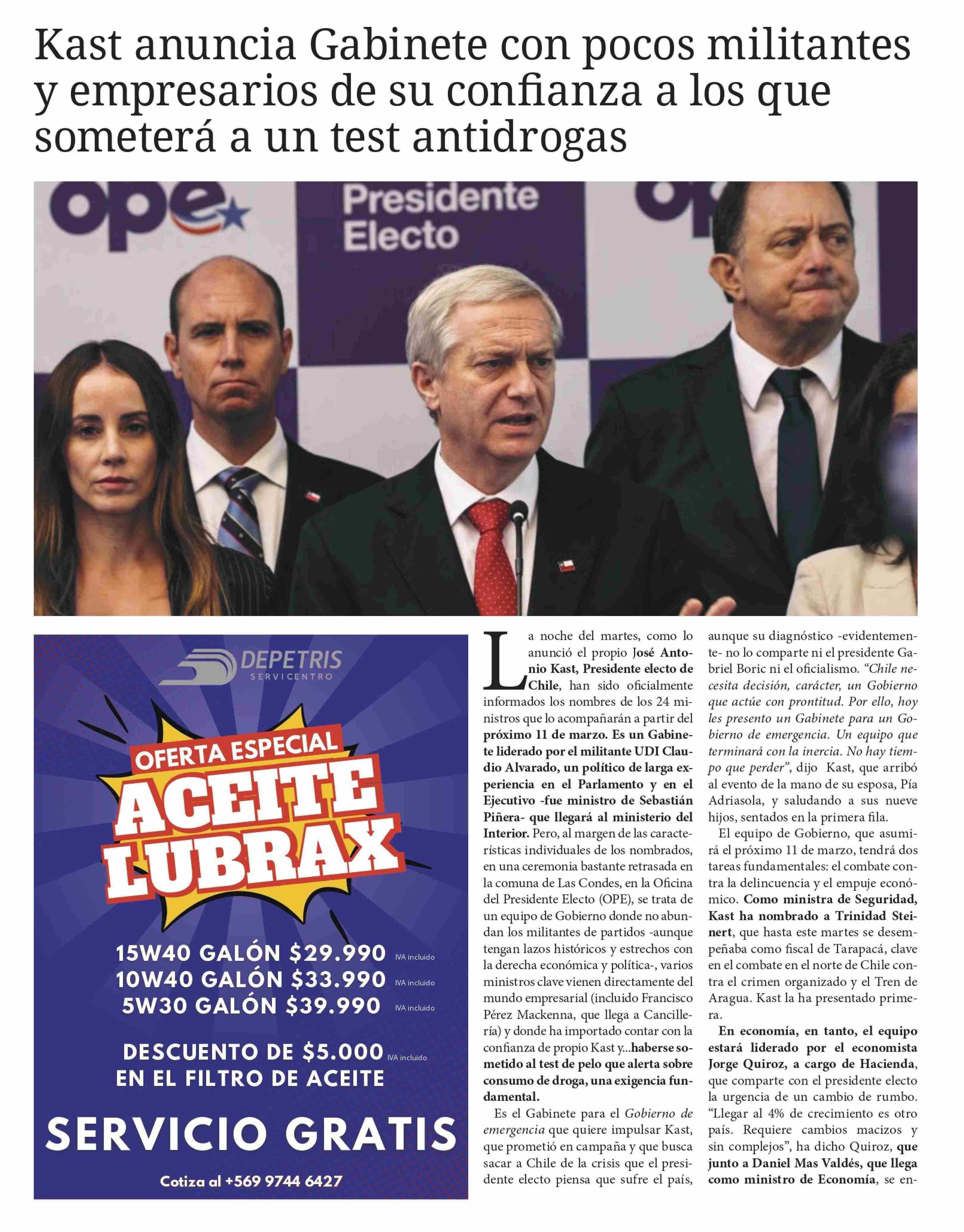 Kast anuncia Gabinete con pocos militantes y empresarios de su confianza a los que someterá a un test antidrogas 21-01-2026 Diario Chañarcillo |