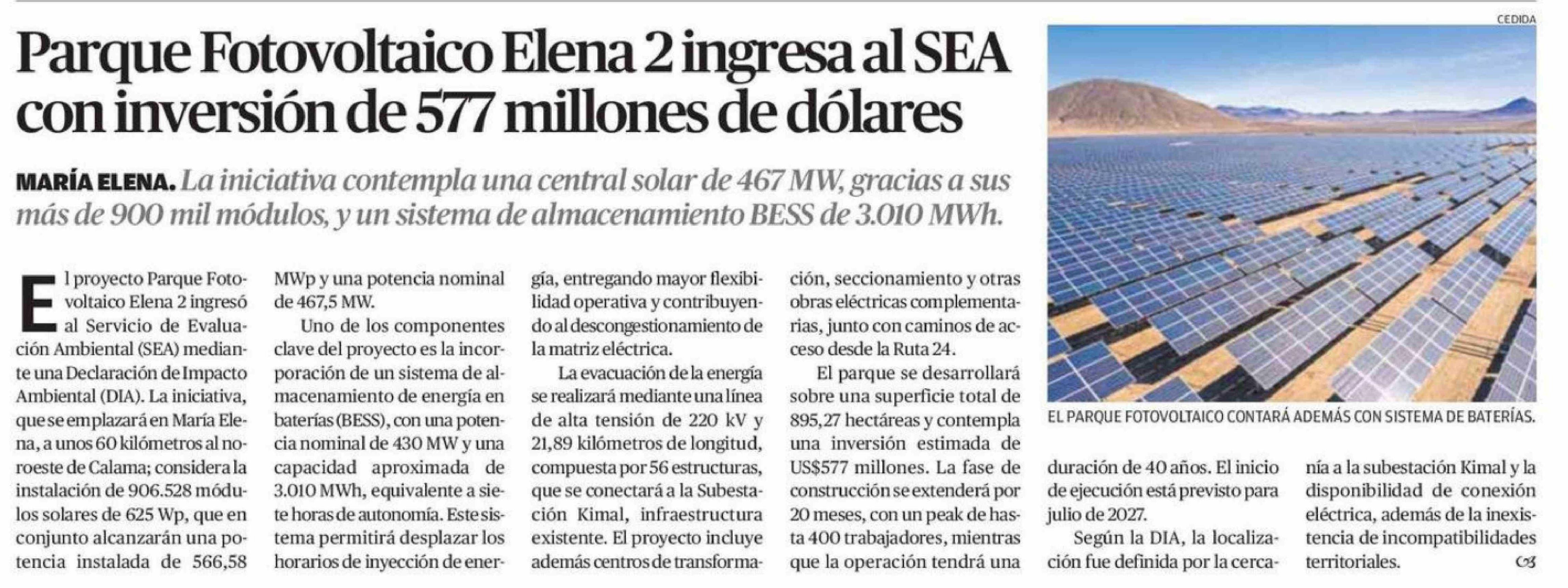 Parque Fotovoltaico Elena 2 ingresa al SEA con inversión de 577 millones de dólares 02-02-2026 El Mercurio de Calama |