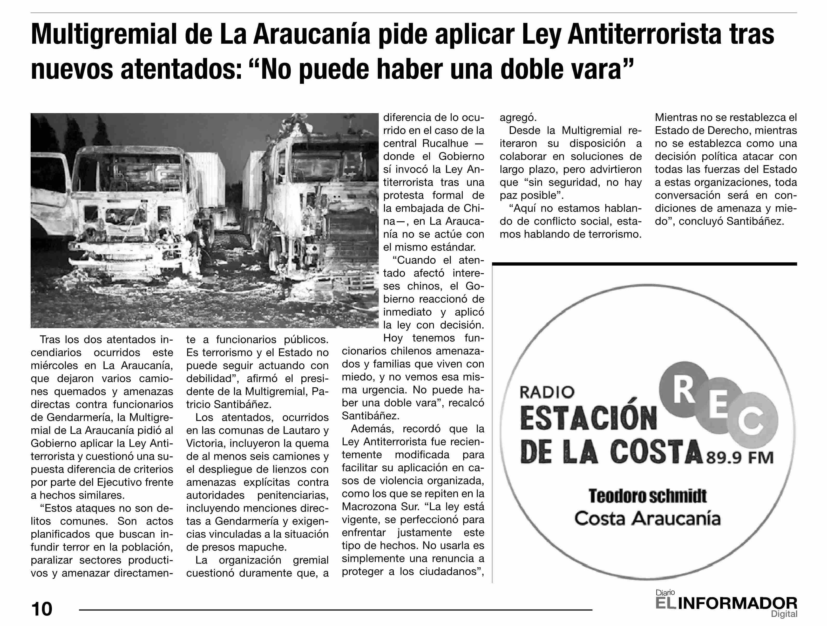 Multigremial de La Araucanía pide aplicar Ley Antiterrorista tras nuevos atentados: “No puede haber una doble vara” 14-06-2025 El Informador |