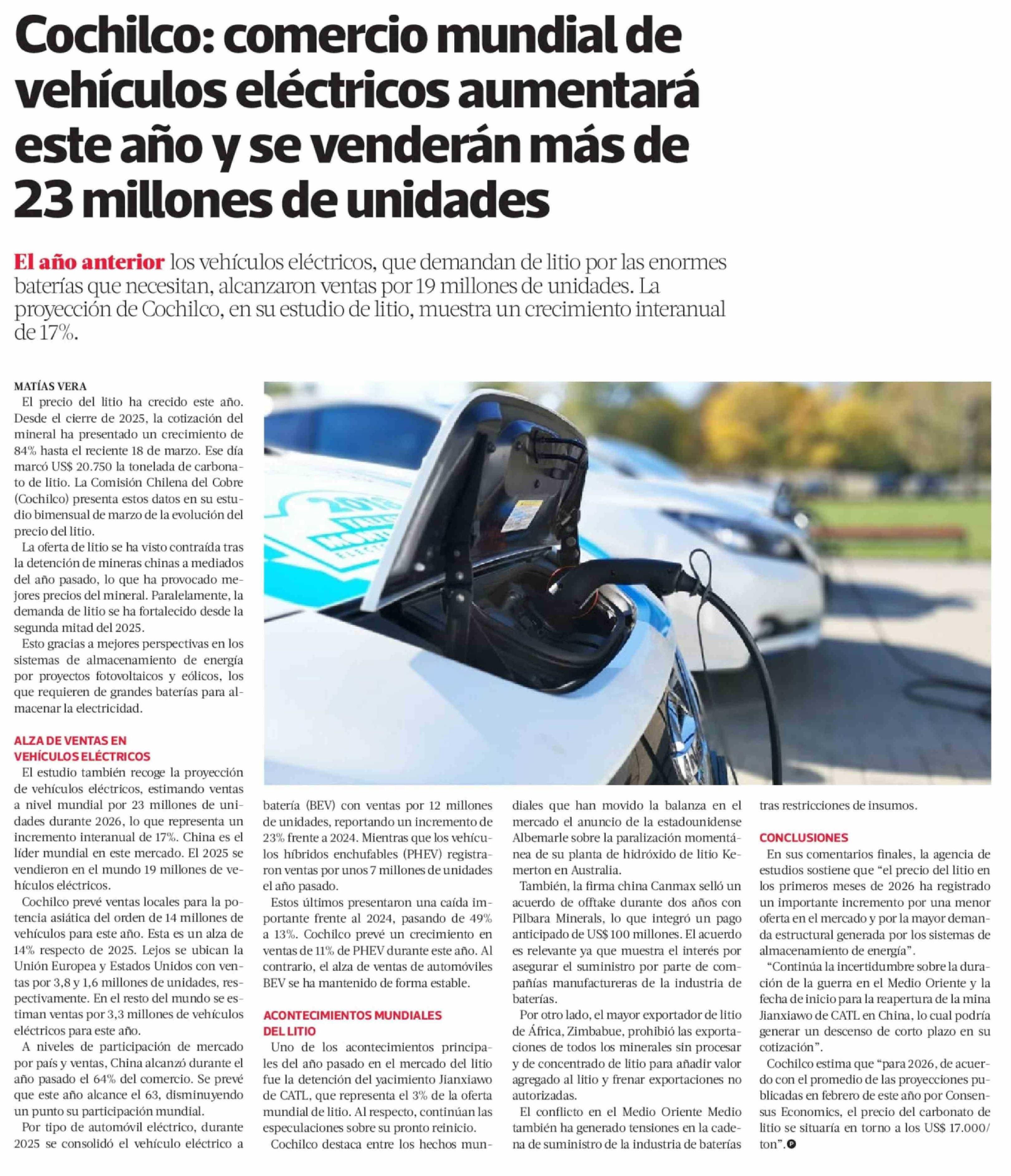 Título: Cochilco: comercio mundial de vehículos eléctricos aumentará este año y se venderán más de 23 millones de unidades