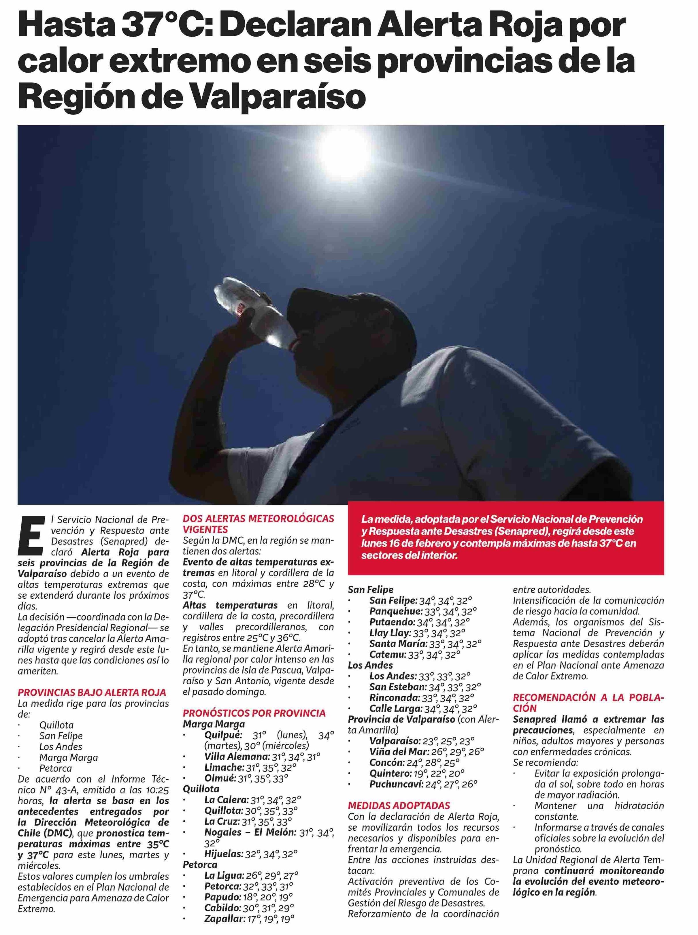 Hasta 37°C: Declaran Alerta Roja por calor extremo en seis provincias de la Región de Valparaíso 16-02-2026 Puranoticia.cl |