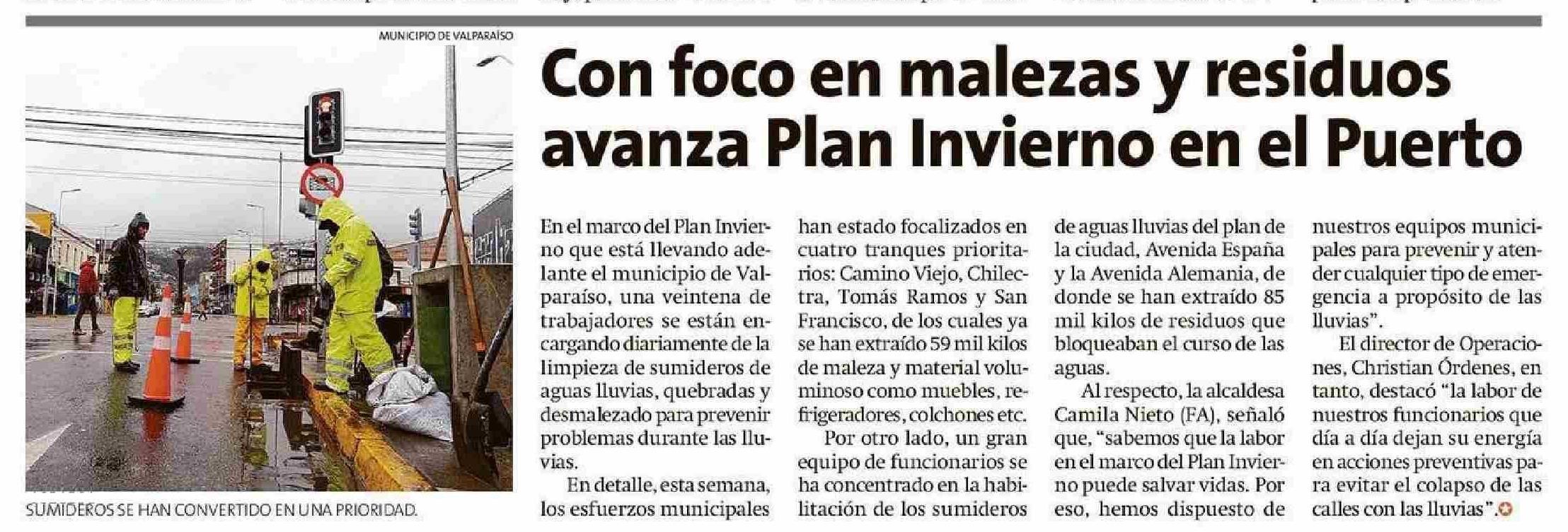 — Con foco en malezas y residuos avanza Plan Invierno en el Puerto 27-05-2025 La Estrella de Valparaíso |