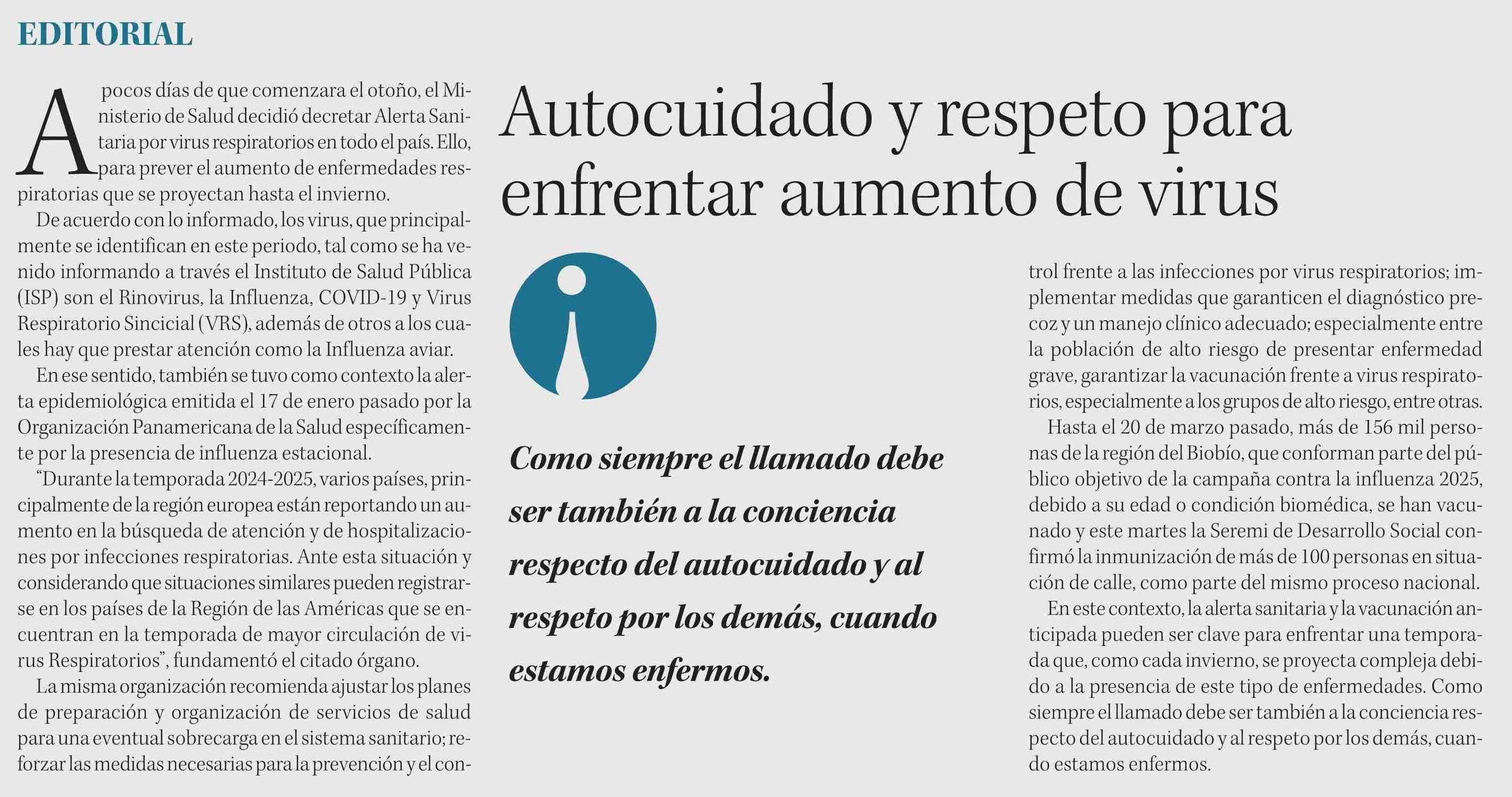 Editorial: Autocuidado y respeto para enfrentar aumento de virus 26-03-2025 Diario Concepción |
