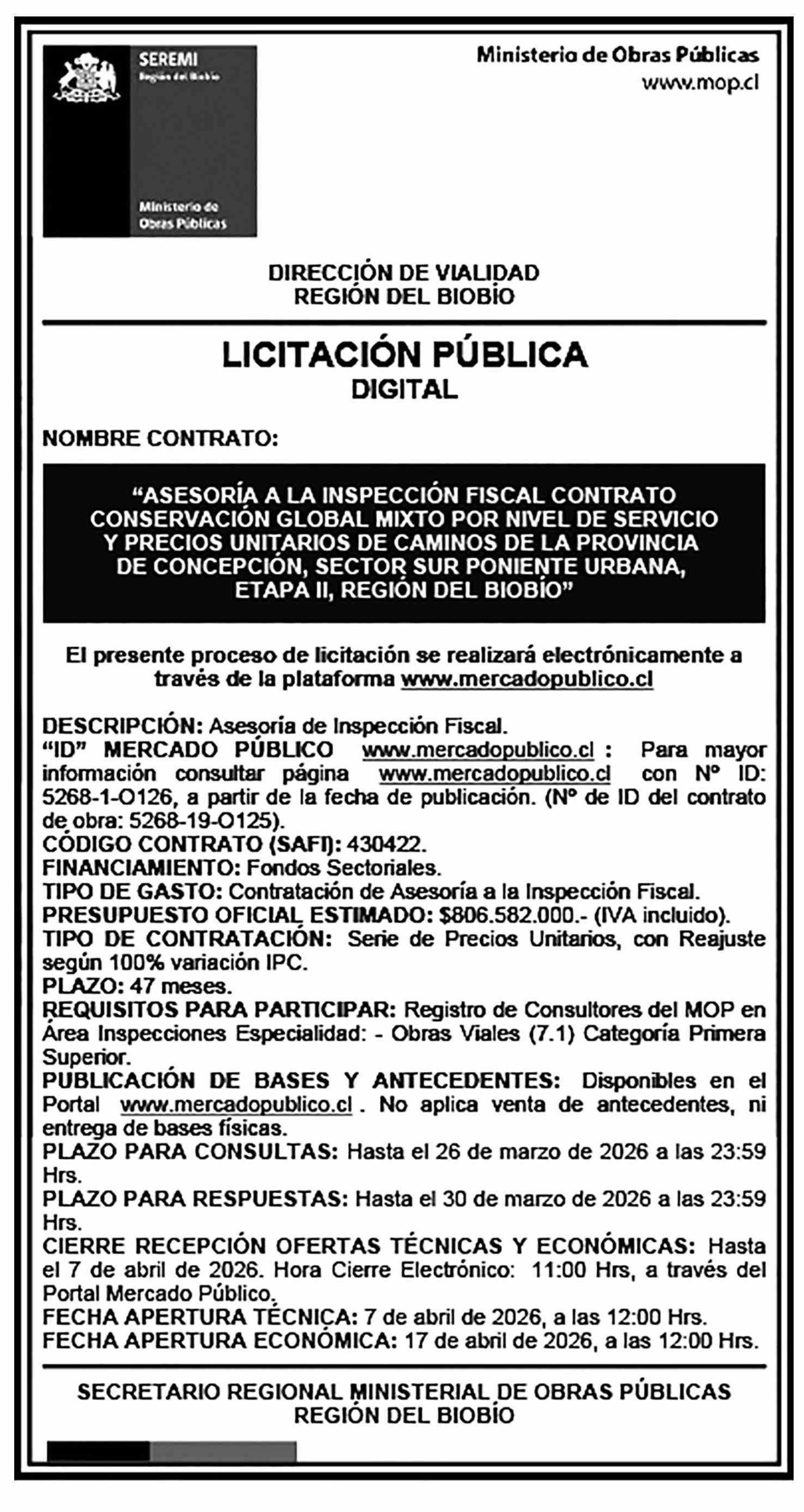 | Título: | AVISO LICITACIONES: “ASESORIA A LA INSPECCIÓN FISCAL CONTRATO CONSERVACIÓN GLOBAL MIXTO POR NIVEL DE SERVICIO Y PRECIOS UNITARIOS DE CAMINOS DE LA PROVINCIA DE CONCEPCIÓN, SECTOR SUR PONIENTE URBANA, ETAPA ll, REGIÓN DEL BIOBÍO” - MOP |