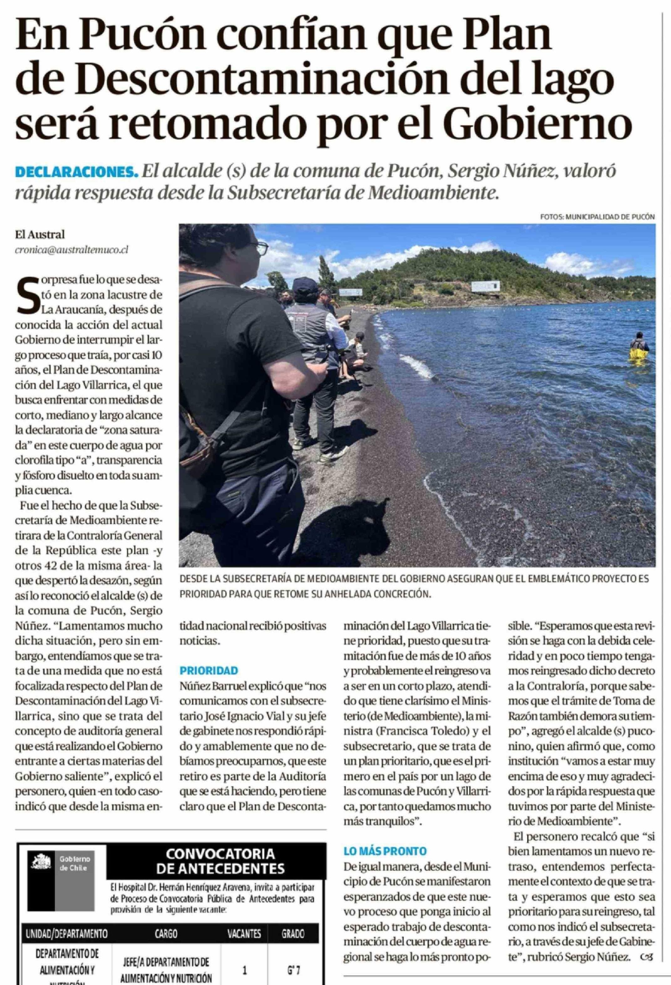 Título: En Pucón confían que Plan de Descontaminación del lago será retomado por el Gobierno