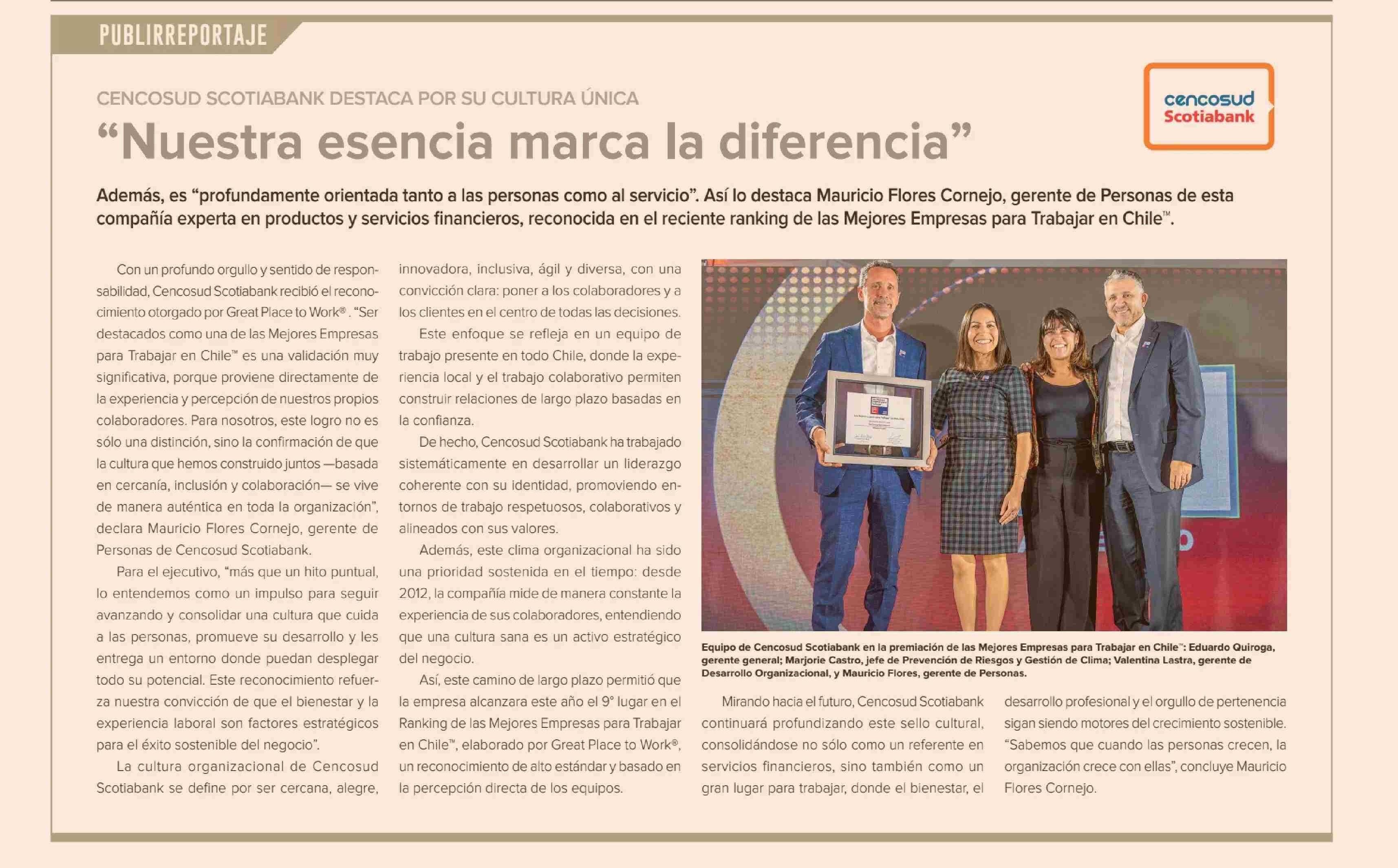 CENCOSUD SCOTIABANK DESTACA POR SU CULTURA ÚNICA “Nuestra esencia marca la diferencia” 09-04-2026 Diario Financiero |