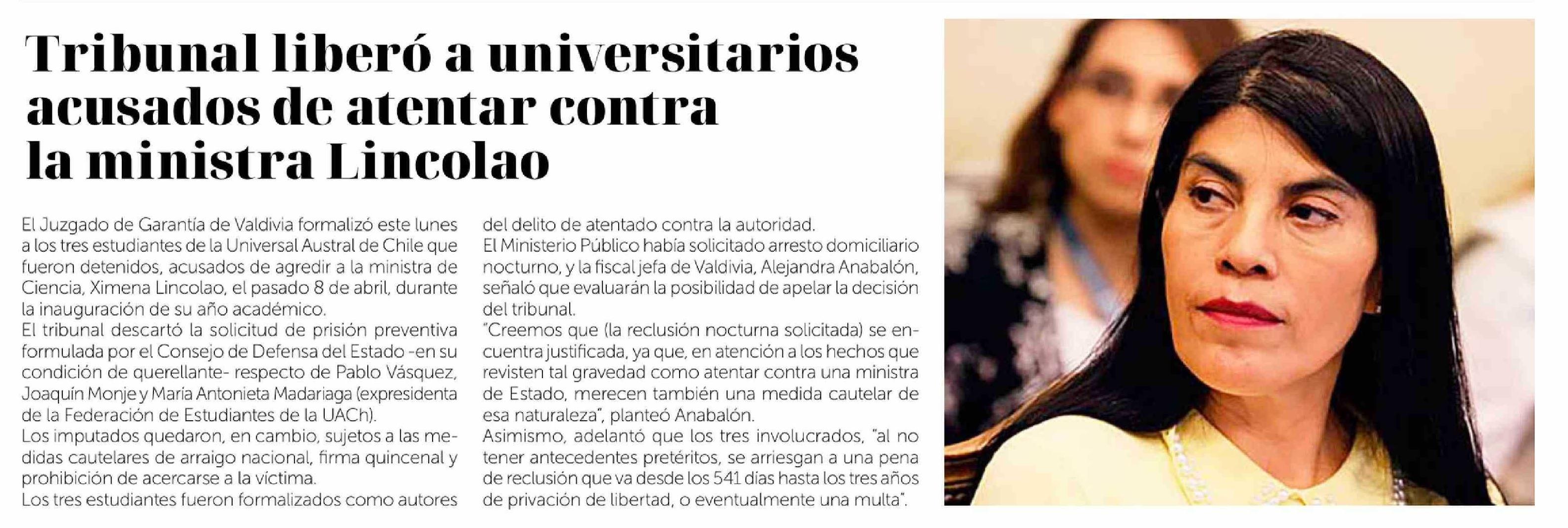 Tribunal liberó a universitarios acusados de atentar contra la ministra Lincolao 21-04-2026 La Discusión |