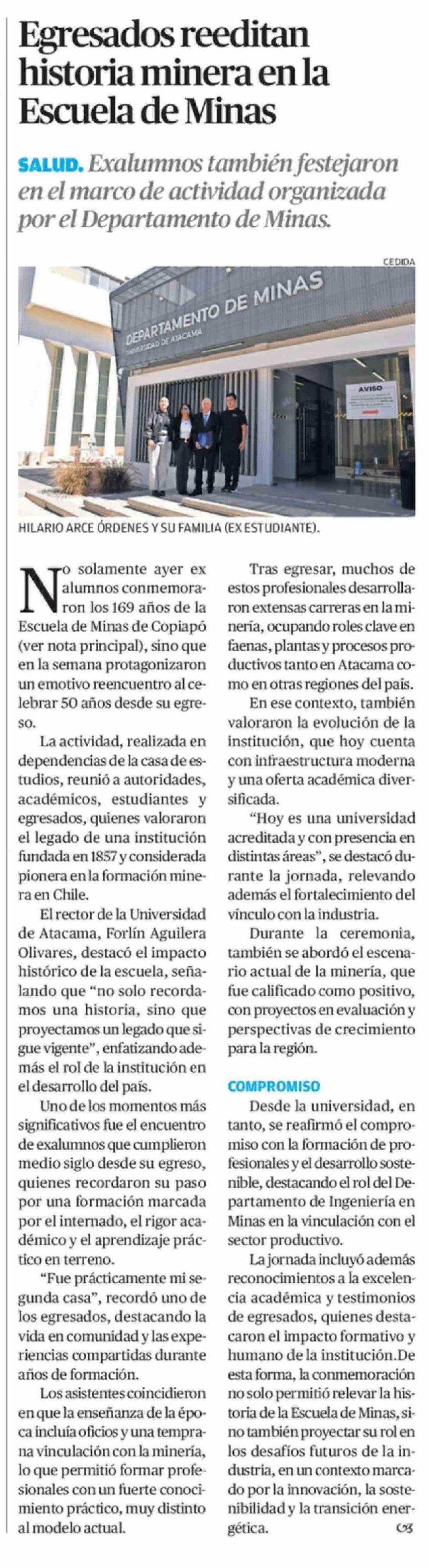 Egresados reeditan historia minera en la Escuela de Minas 12-04-2026 El Diario de Atacama |