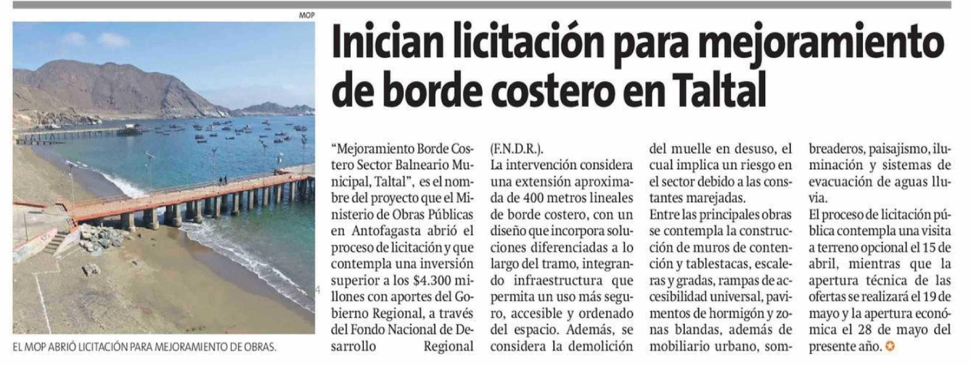 Inician licitación para mejoramiento de borde costero en Taltal 13-04-2026 La Estrella de Antofagasta |