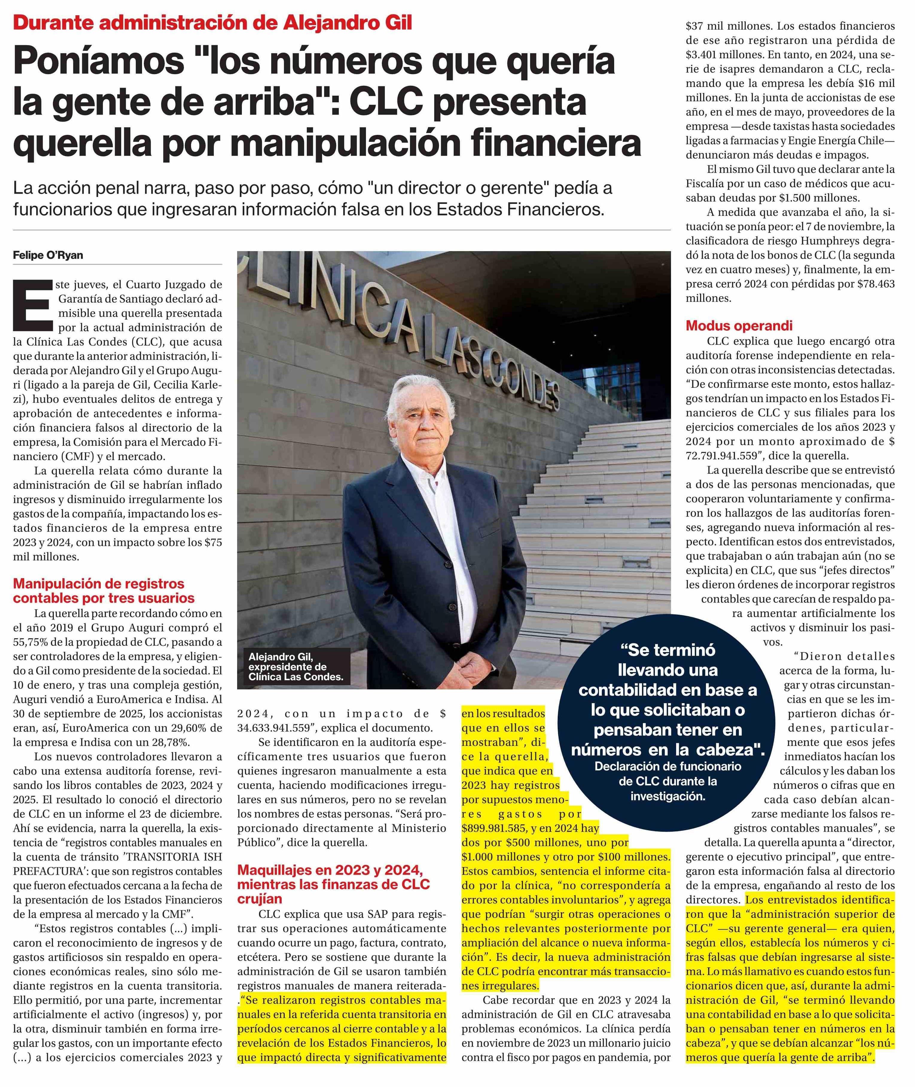 Poníamos "los números que quería la gente de arriba": CLC presenta querella por manipulación financiera 23-01-2026 La Segunda |