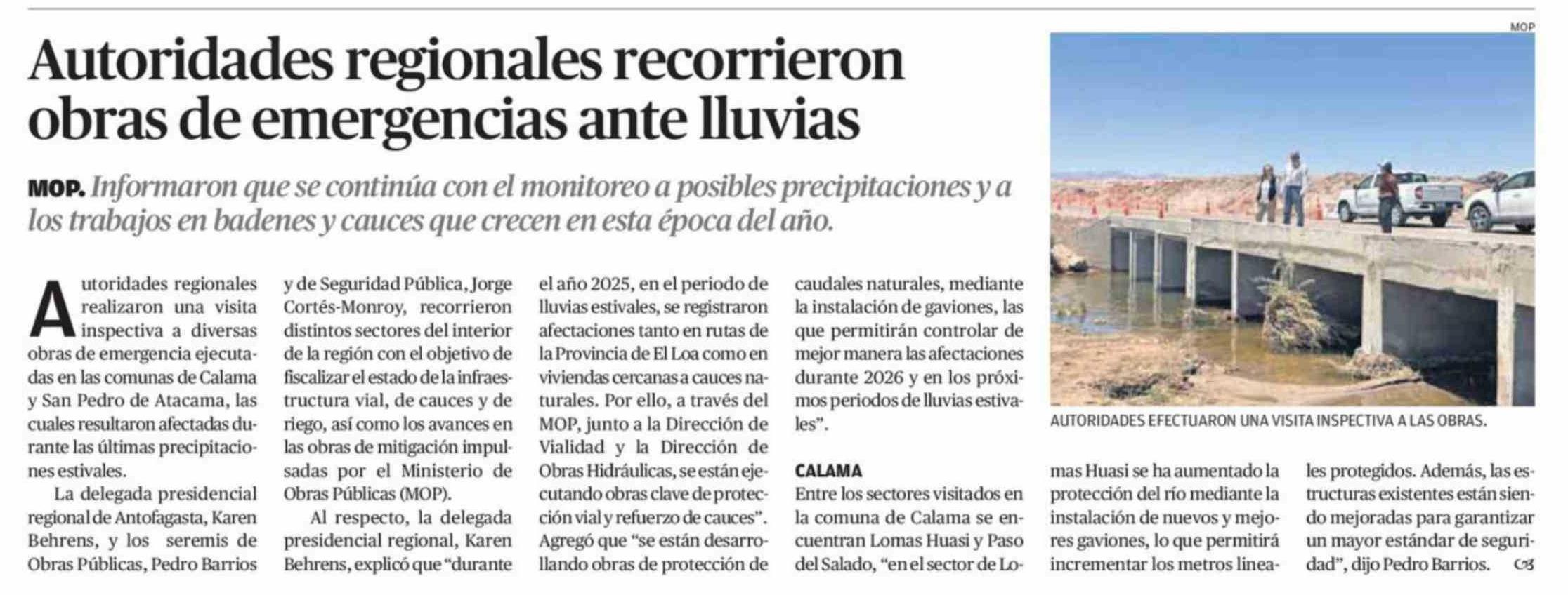 Autoridades regionales recorrieron obras de emergencias ante lluvias 15-02-2026 El Mercurio de Calama |