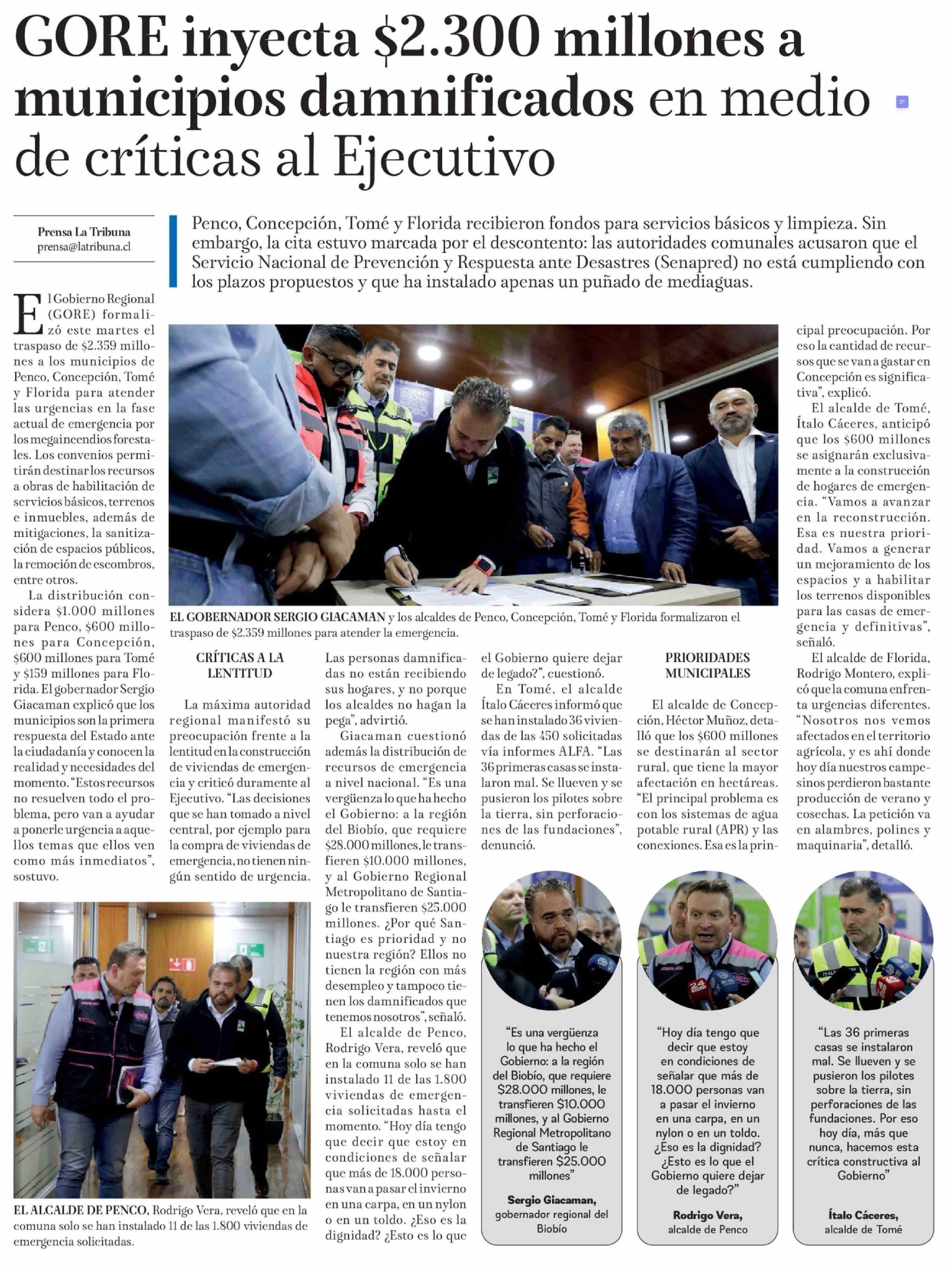 Título: GORE inyecta $2.300 millones a municipios damnificados en medio de críticas al Ejecutivo