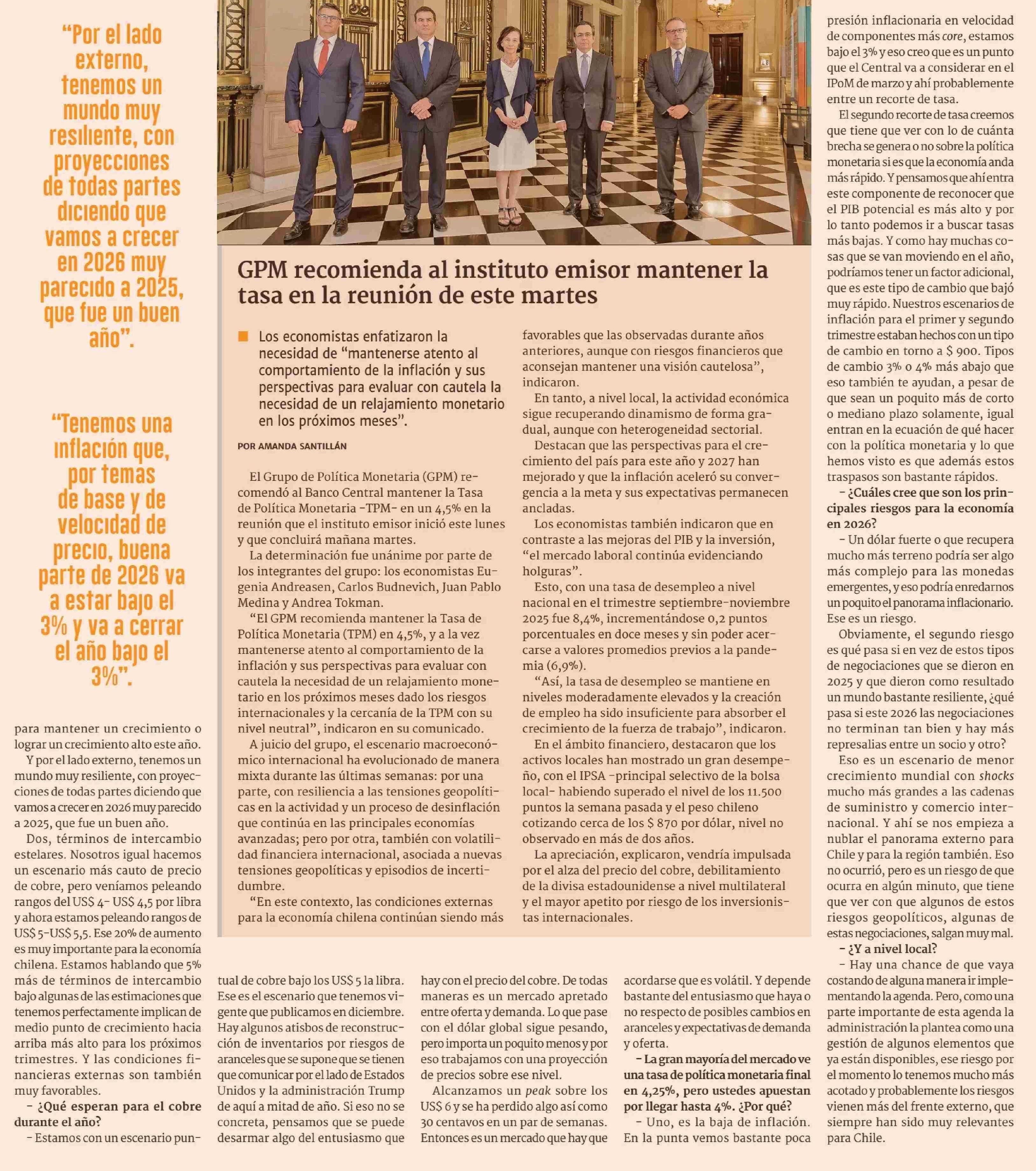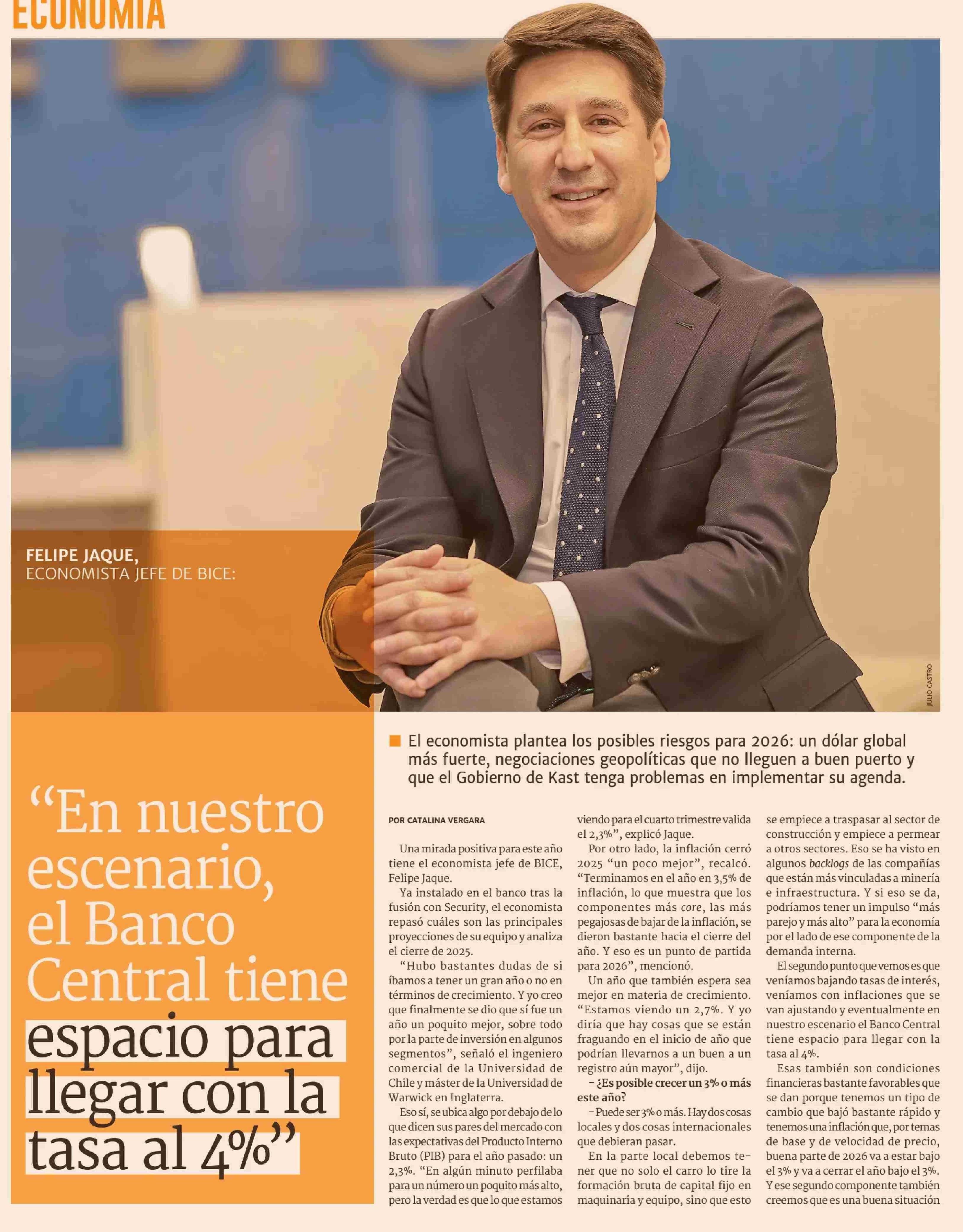 "En nuestro escenario, el Banco Central tiene espacio para llegar con la tasa al 4%" 27-01-2026 Diario Financiero |