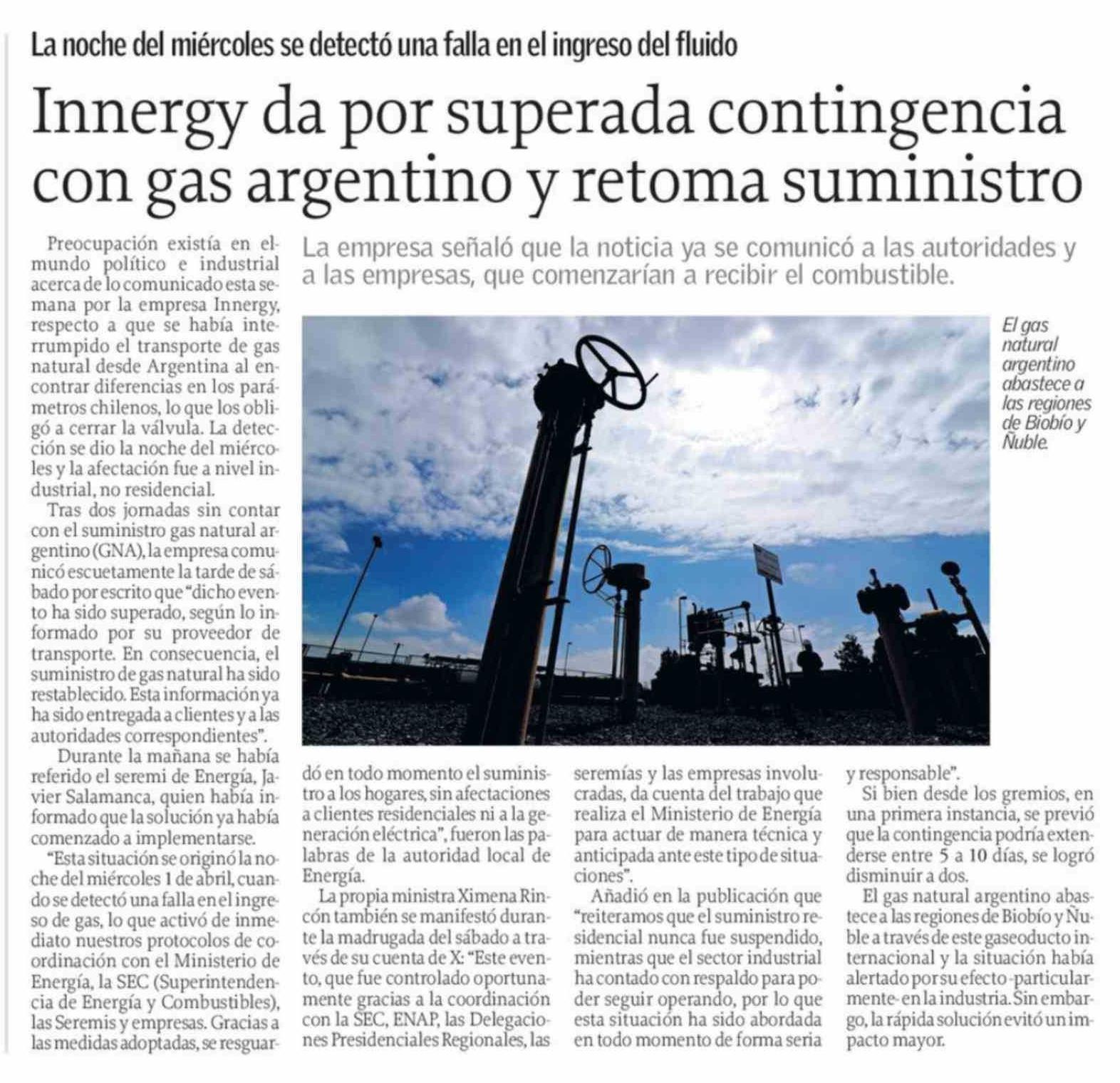 Innergy da por superada contingencia con gas argentino y retoma suministro 05-04-2026 El Sur |