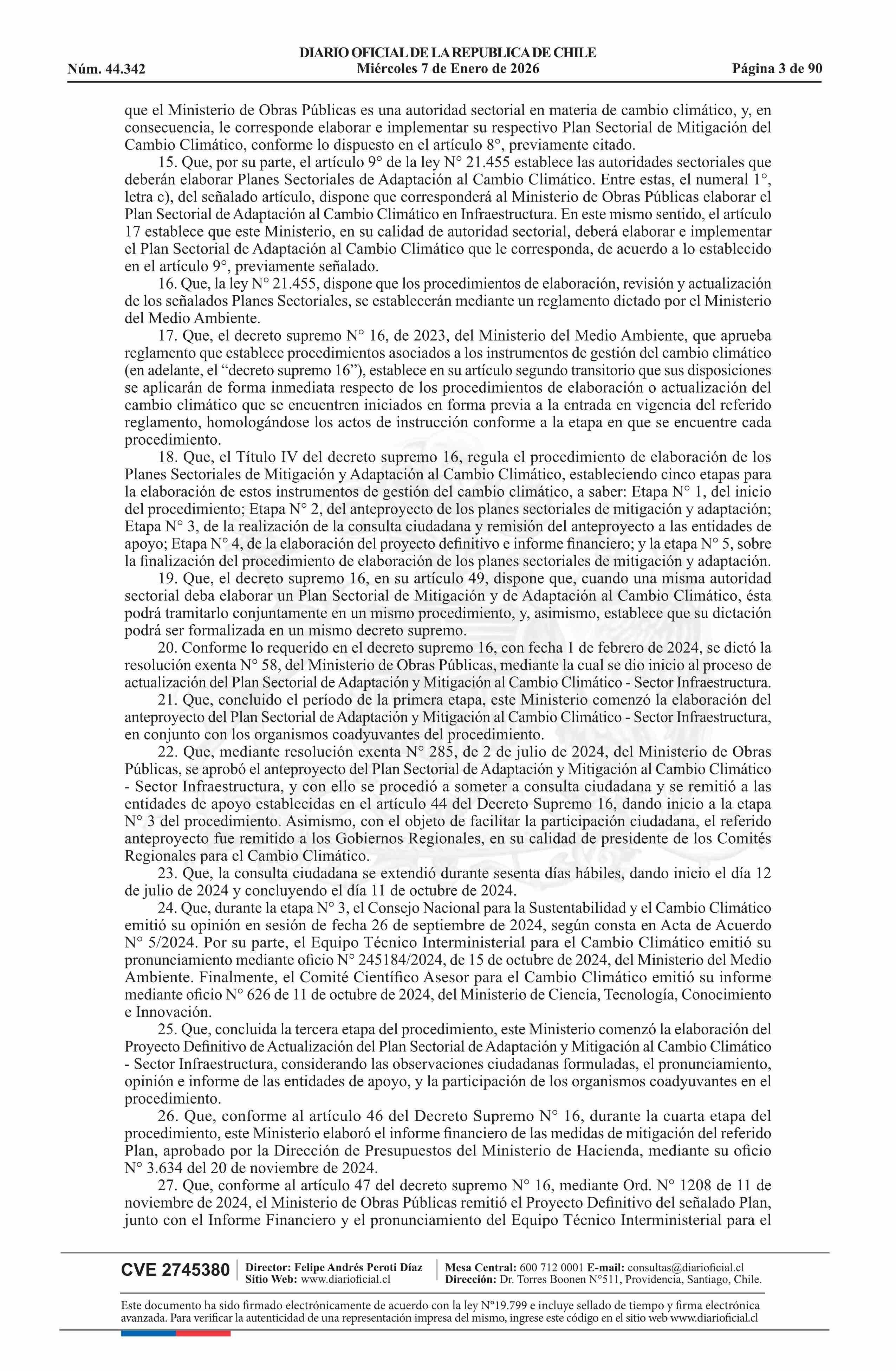 | Título: | Decreto número 167, de 2024.- Aprueba actualización del Plan Sectorial de Adaptación y Mitigación al Cambio Climático - Sector Infraestructura |