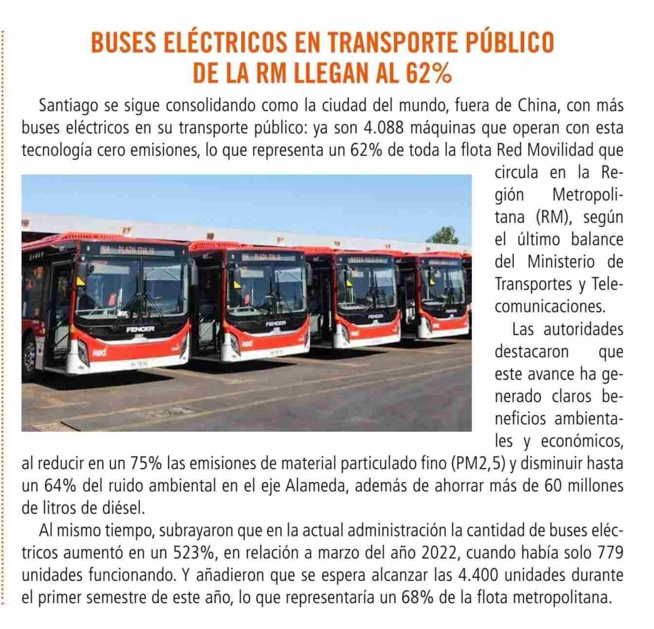 | Título: | BUSES ELÉCTRICOS EN TRANSPORTE PÚBLICO DE LA RM LLEGAN AL 62% |