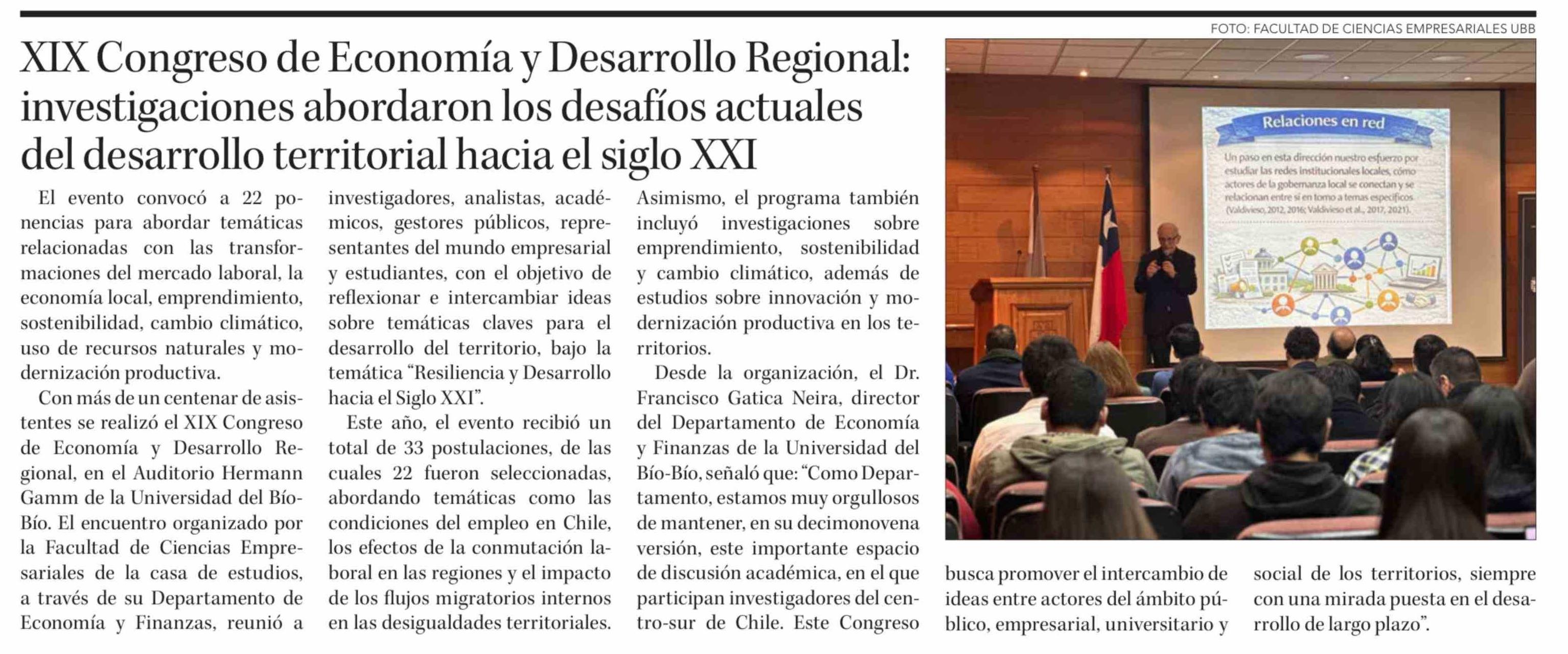 XIX Congreso de Economía y Desarrollo Regional: investigaciones abordaron los desafíos actuales del desarrollo territorial hacia el siglo XXI 28-04-2026 Diario Concepción |