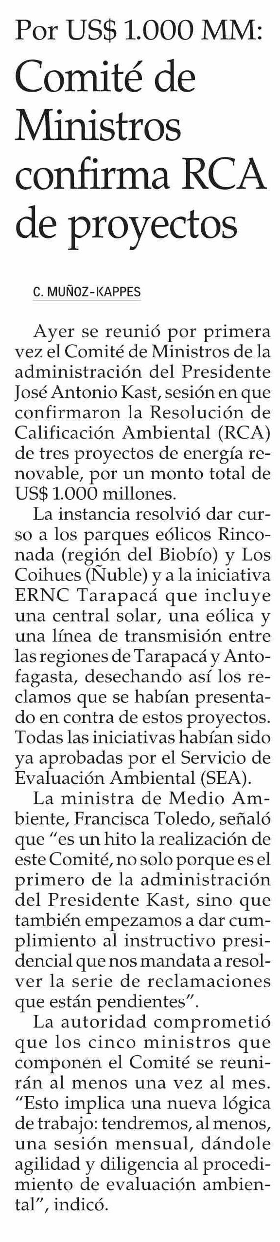 | Título: | Comité de Ministros confirma RCA de proyectos |