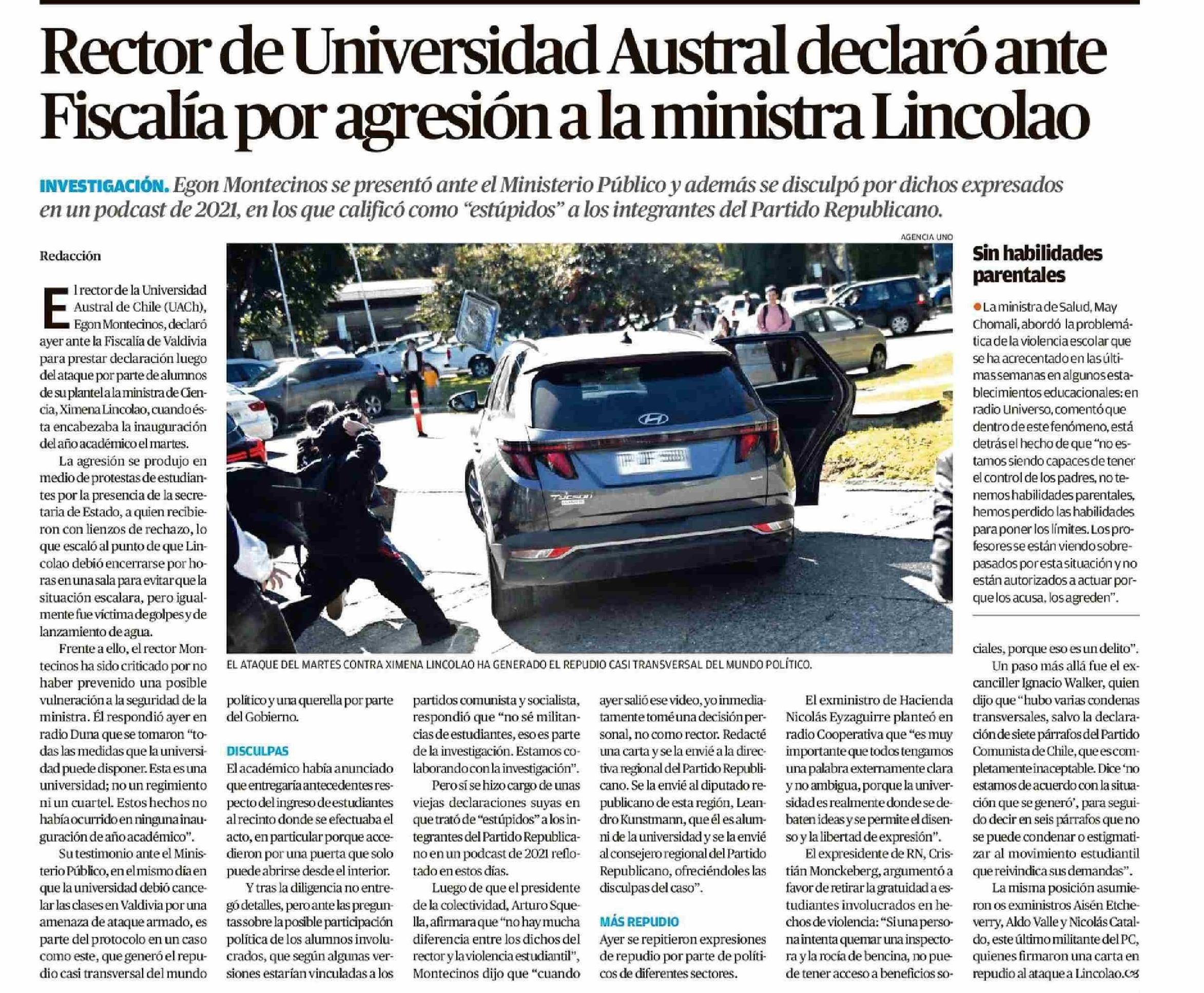Rector de Universidad Austral declaró ante Fiscalía por agresión a la ministra Lincolao 11-04-2026 El Austral de Osorno |