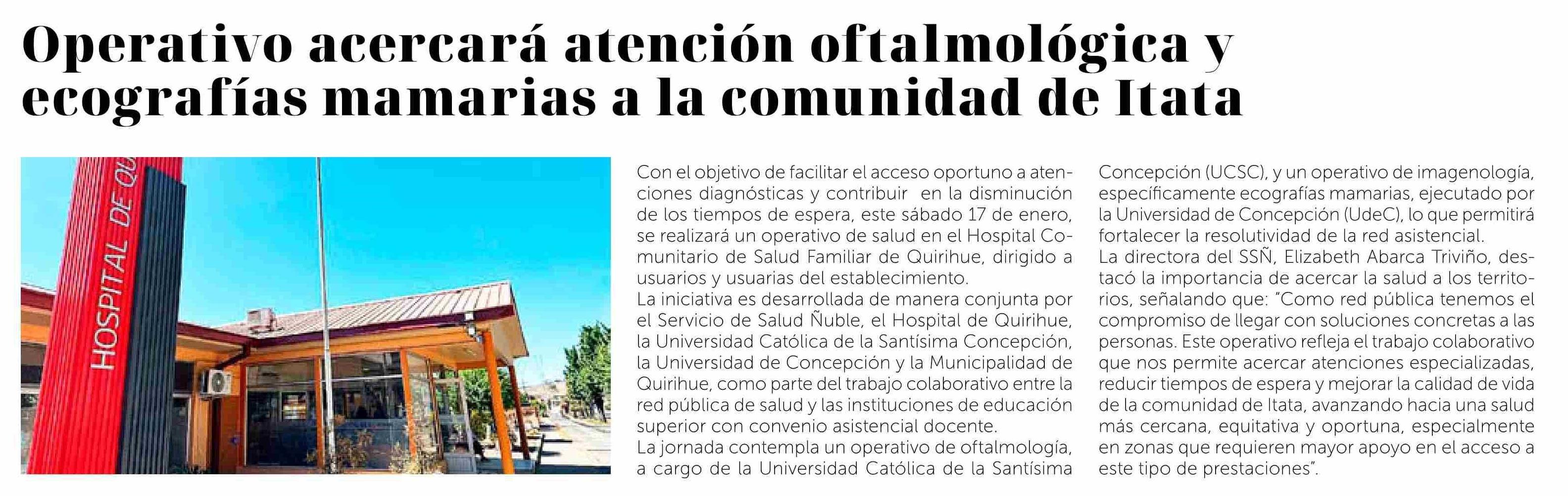 Operativo acercará atención oftalmológica y ecografías mamarias a la comunidad de Itata 15-01-2026 La Discusión |