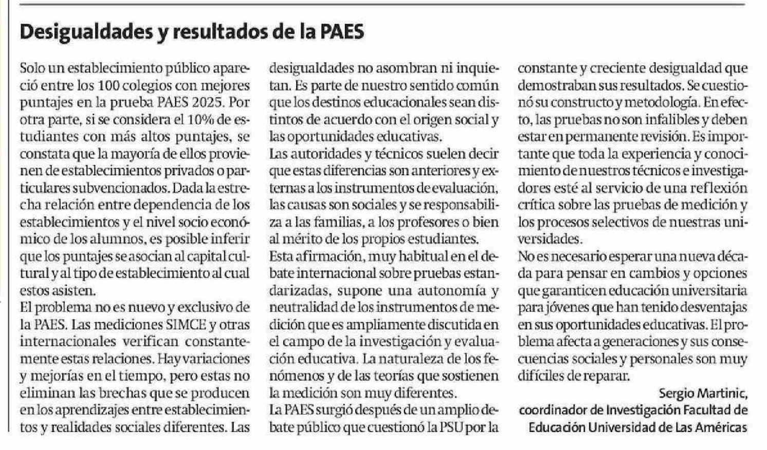 | Título: | Columnas de Opinión: Desigualdades y resultados de la PAES |