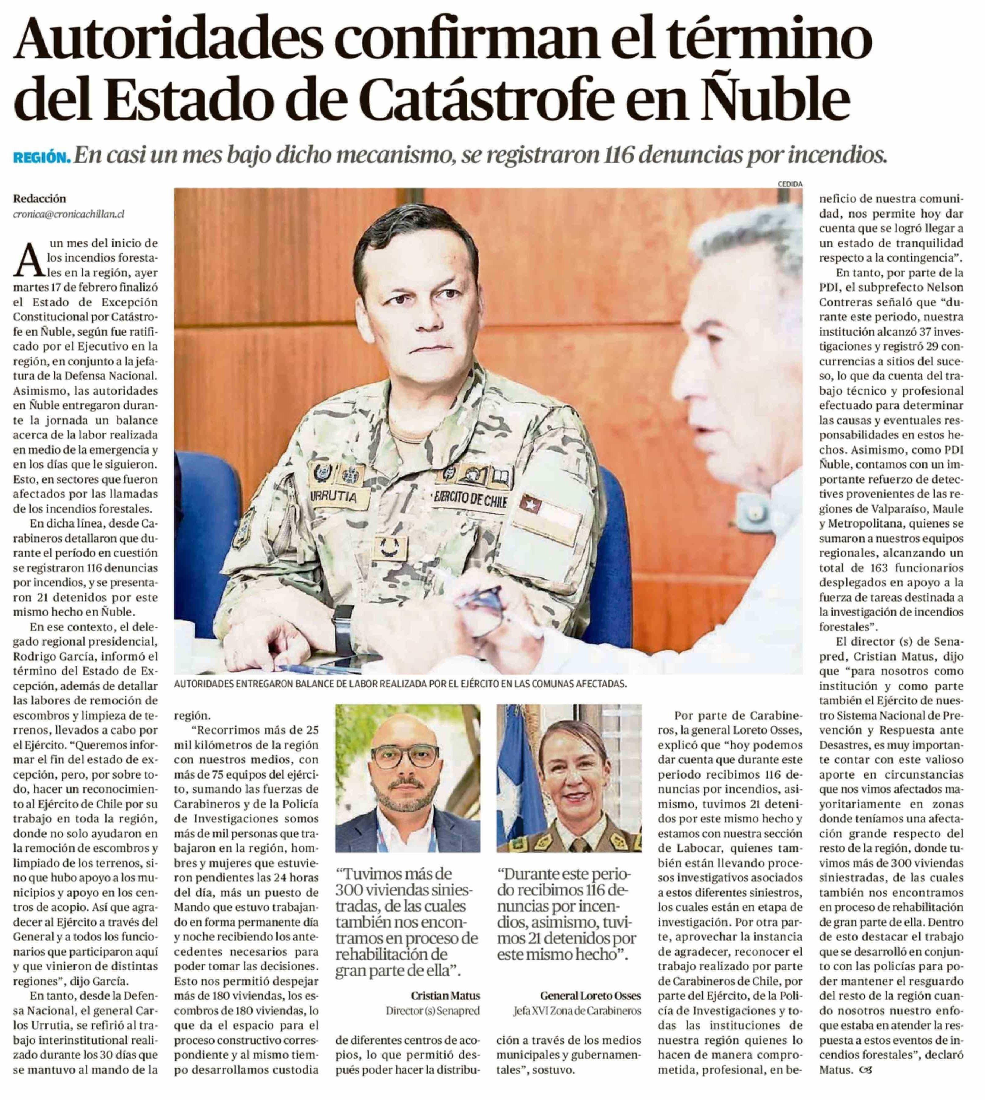 Autoridades confirman el término del Estado de Catástrofe en Nuble 18-02-2026 Crónica de Chillán |