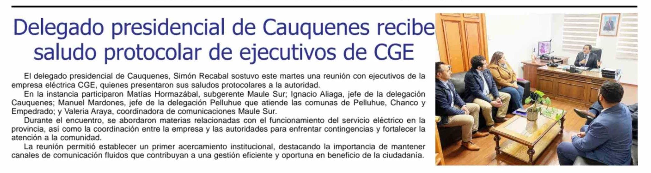 Delegado presidencial de Cauquenes recibe saludo protocolar de ejecutivos de CGE 08-04-2026 Maule Hoy |