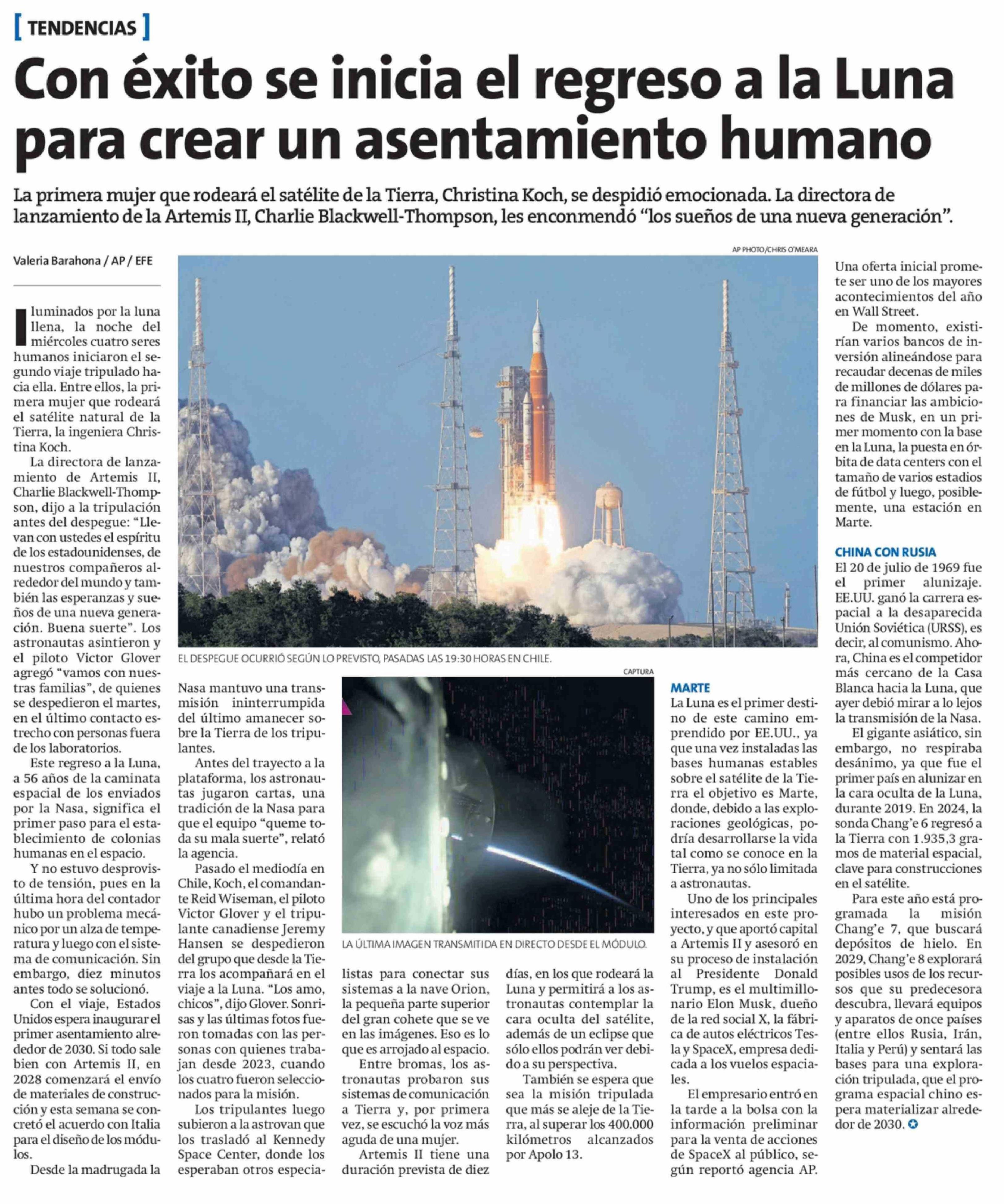 Con éxito se inicia el regreso a la Luna para crear un asentamiento humano 03-04-2026 La Estrella de Antofagasta |