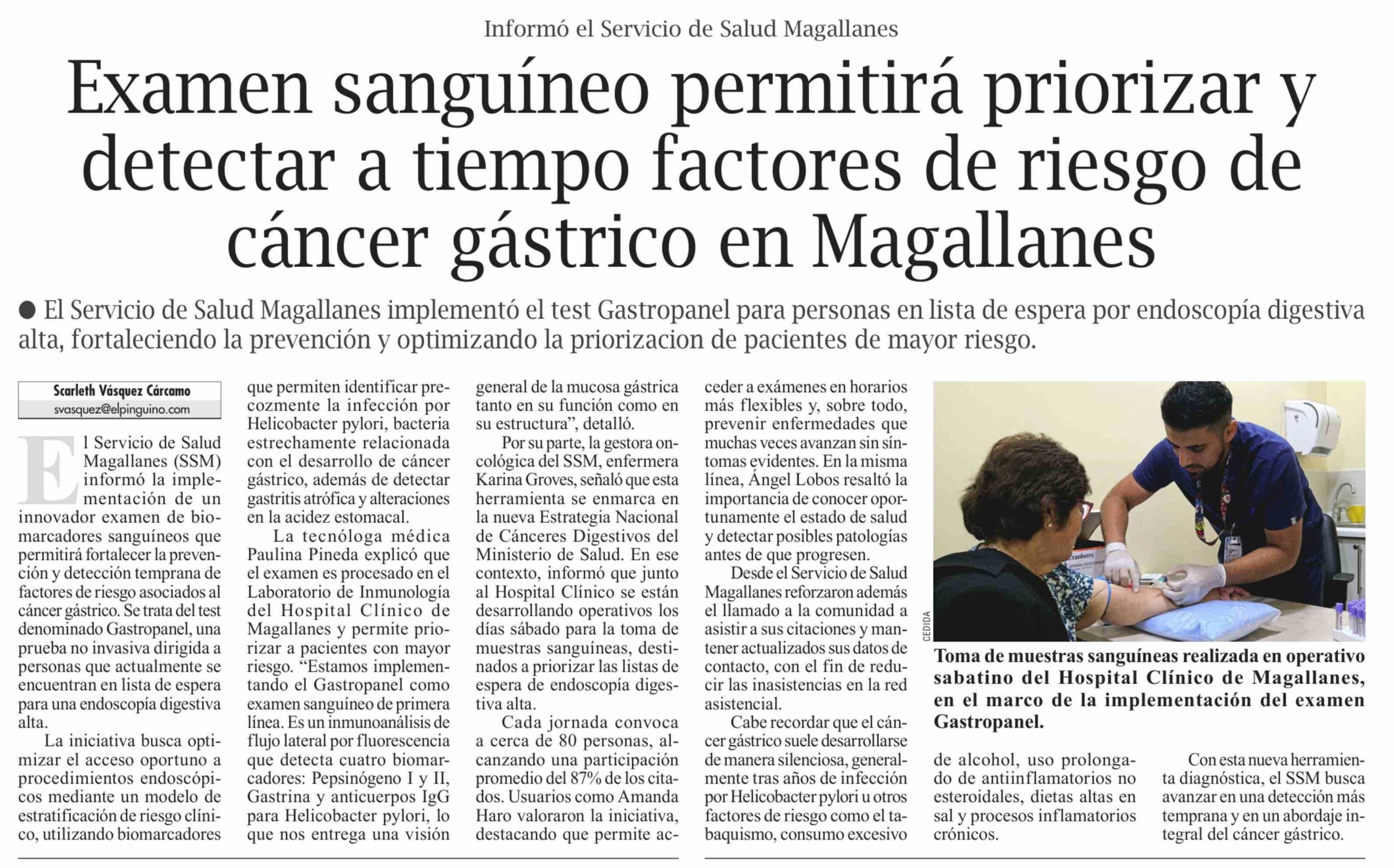 Examen sanguíneo permitirá priorizar y detectar a tiempo factores de riesgo de cáncer gástrico en Magallanes 27-02-2026 El Pingüino |