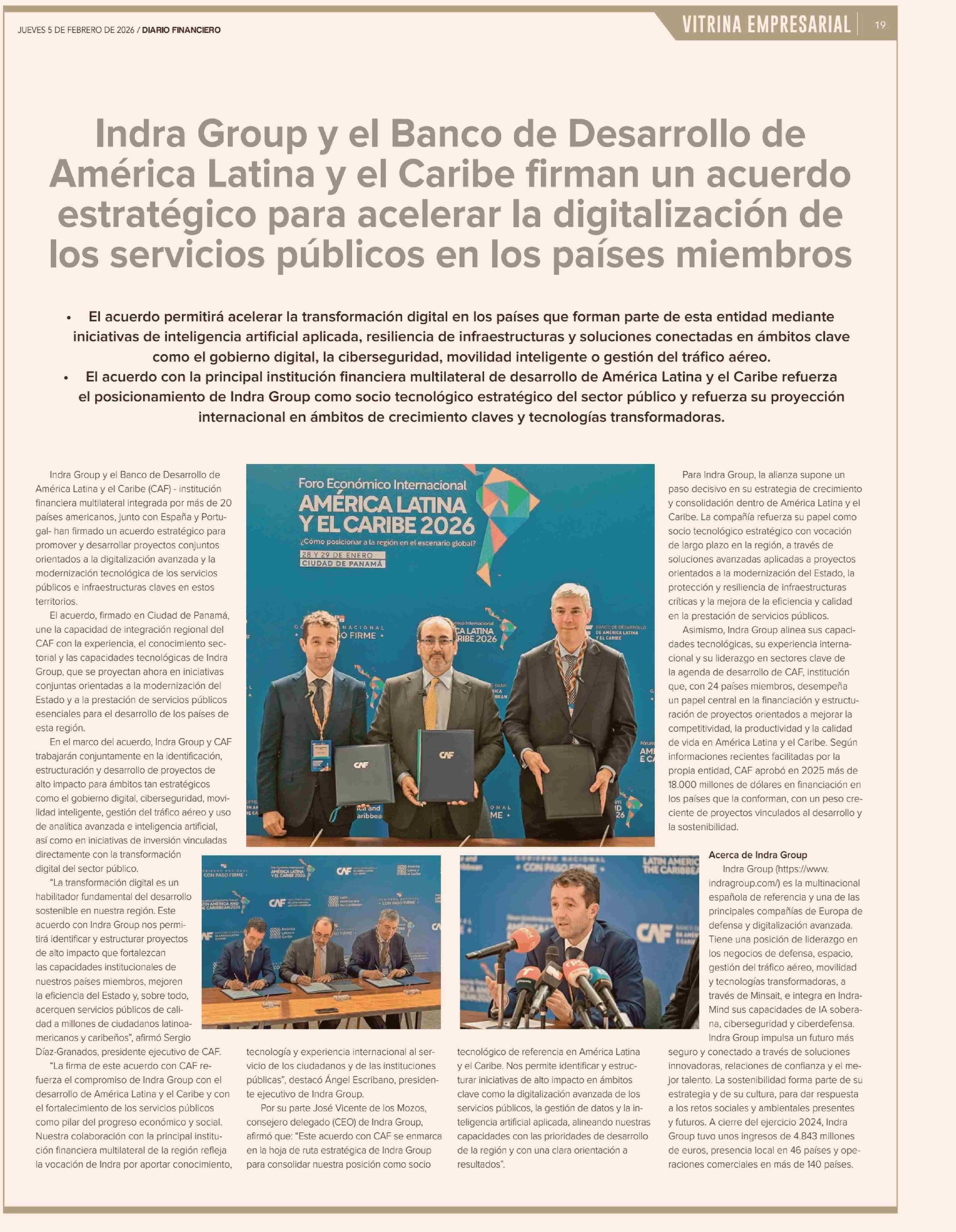 Título: Indra Group y el Banco de Desarrollo de América Latina y el Caribe firman un acuerdo estratégico para acelerar la digitalización de los servicios públicos en los países miembros