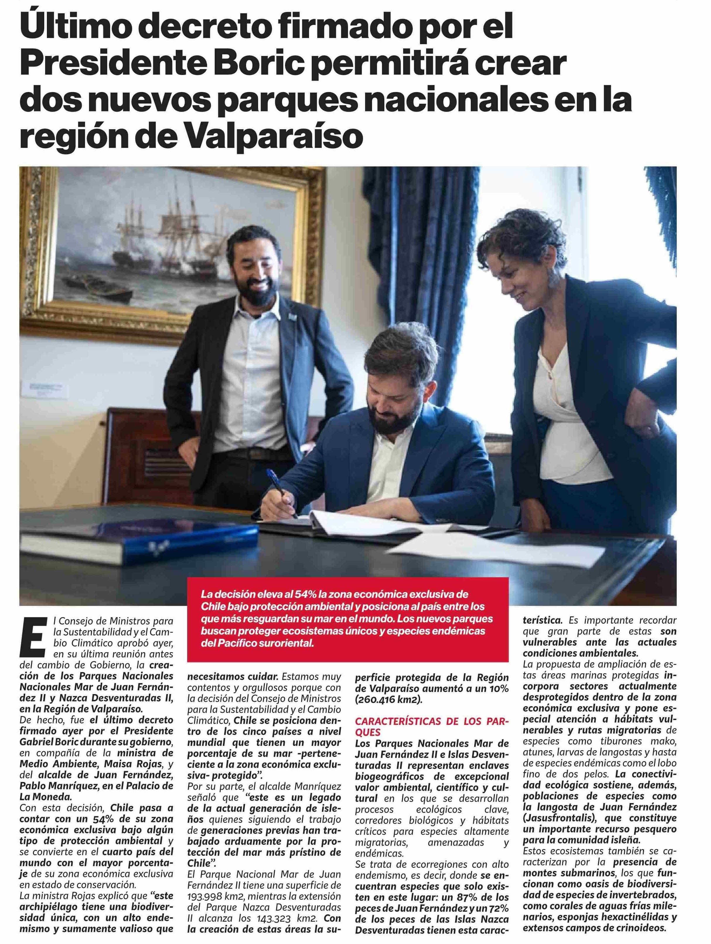 Ultimo decreto firmado por el Presidente Boric permitirá crear dos nuevos parques nacionales en la región de Valparaíso 11-03-2026 Puranoticia.cl |