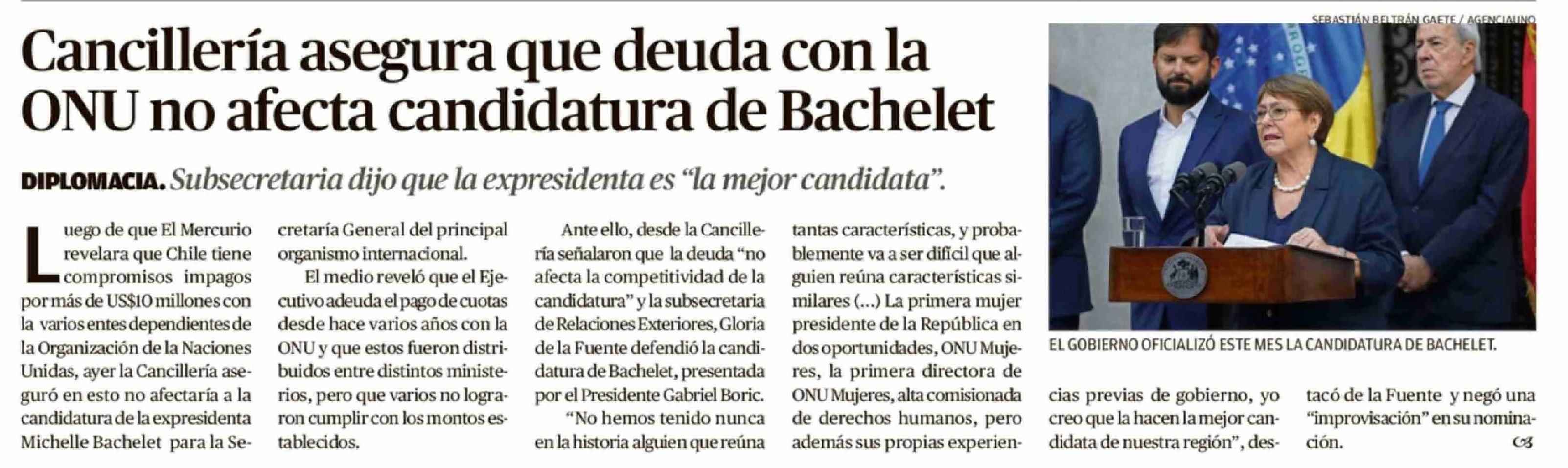 Título: Cancillería asegura que deuda con la ONU no afecta candidatura de Bachelet
