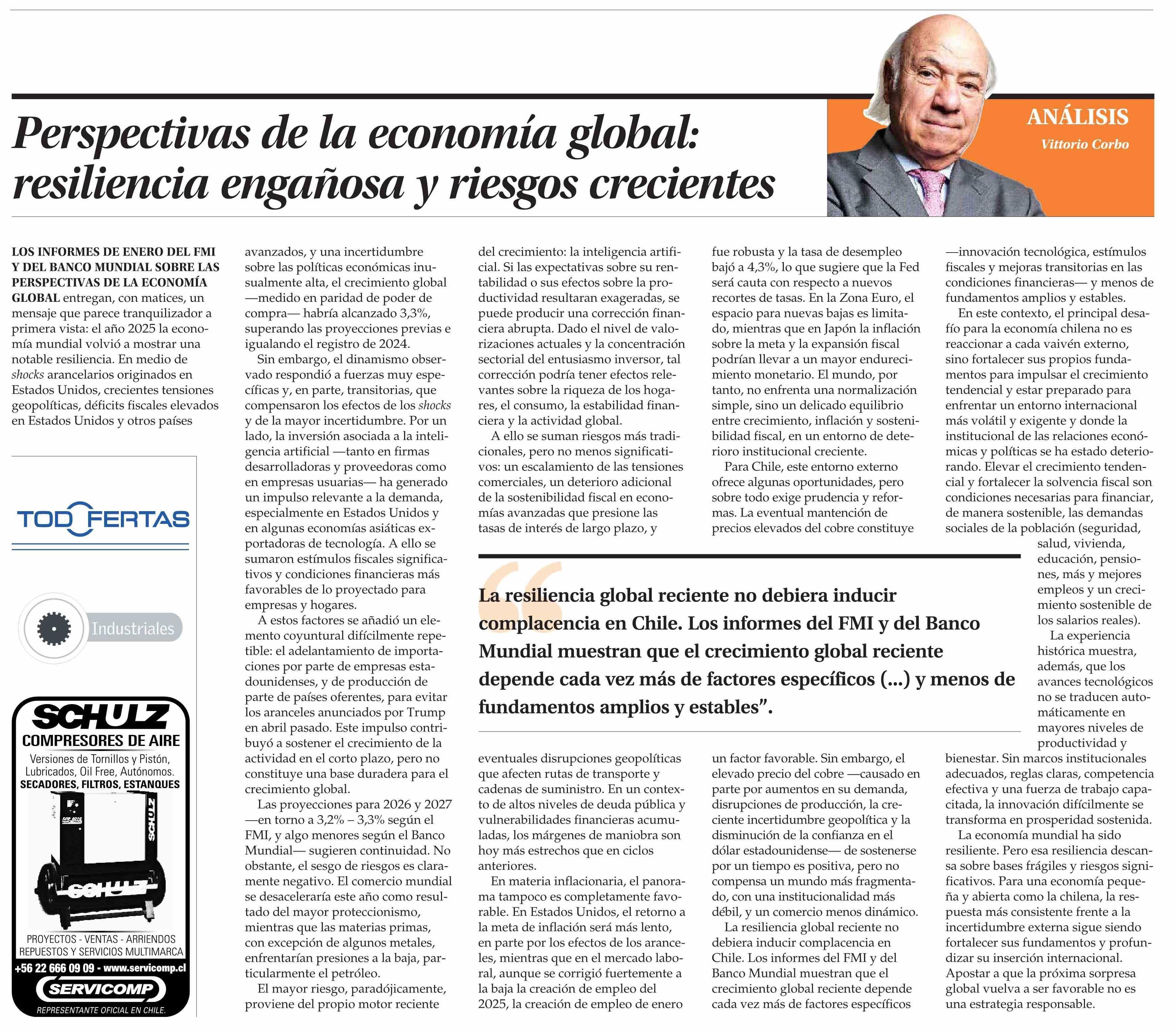 Columnas de Opinión: Perspectivas de la economía global: resiliencia engañosa y riesgos crecientes 15-02-2026 El Mercurio |